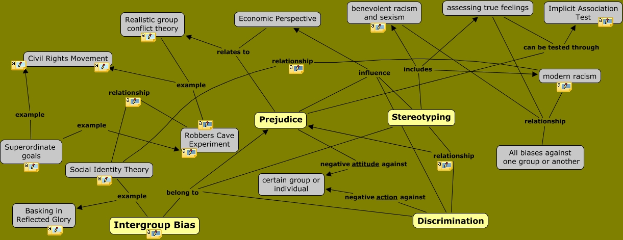 This Concept Map, created with IHMC CmapTools, has information related to: SPD, Realistic group conflict theory example Civil Rights Movement, Social Identity Theory example Intergroup Bias, Prejudice negative attitude against certain group or individual, Superordinate goals example Robbers Cave Experiment, Prejudice can be tested through Implicit Association Test, Discrimination influence Economic Perspective, assessing true feelings relationship All biases against one group or another, modern racism relationship Social Identity Theory, Realistic group conflict theory example Robbers Cave Experiment, Stereotyping includes benevolent racism and sexism, Stereotyping relationship Discrimination, modern racism relationship All biases against one group or another, Prejudice influence Economic Perspective, Intergroup Bias belong to Prejudice, Stereotyping relationship Prejudice, benevolent racism and sexism relationship All biases against one group or another, Stereotyping includes modern racism, Stereotyping includes assessing true feelings, Superordinate goals example Civil Rights Movement, Economic Perspective relates to Realistic group conflict theory