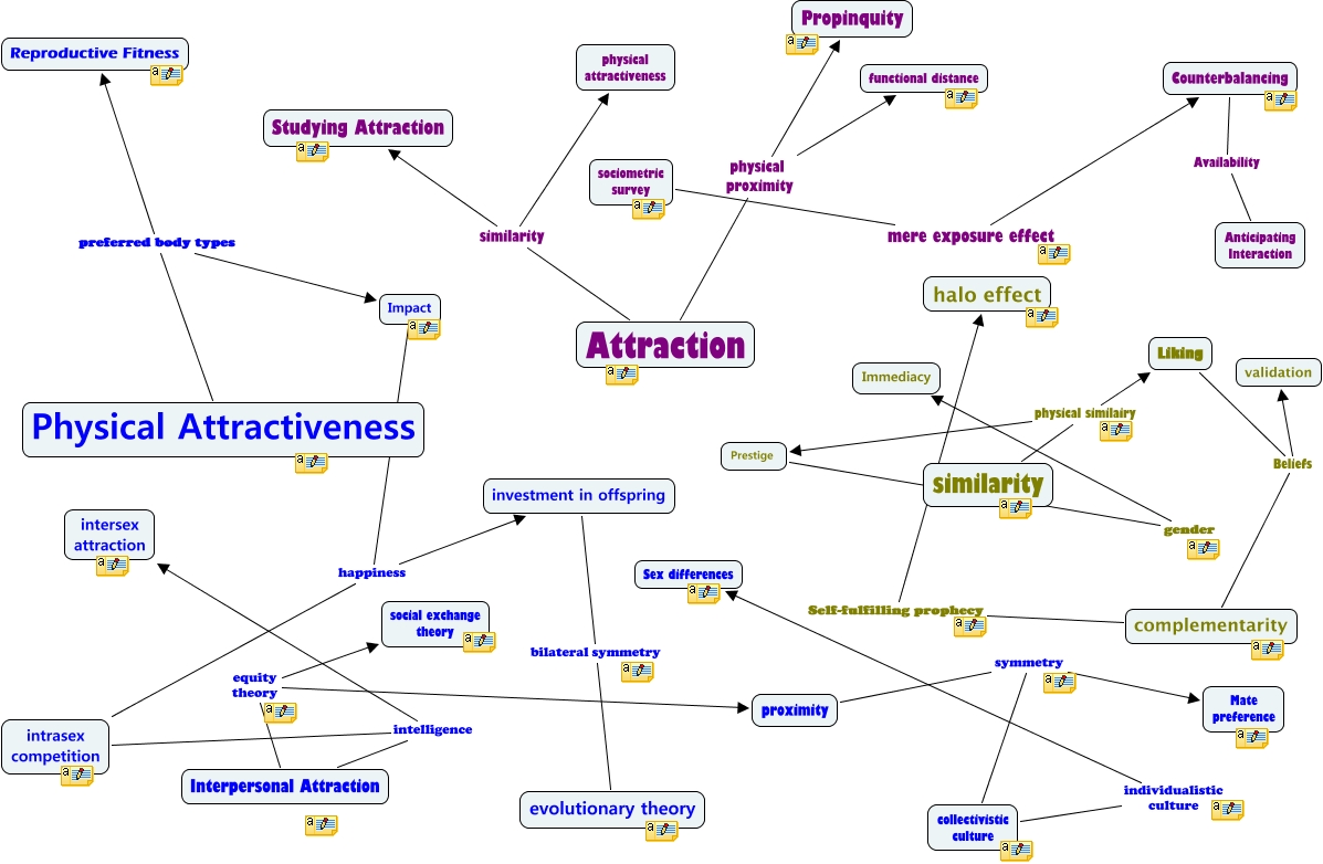This Concept Map, created with IHMC CmapTools, has information related to: Attraction - SOC 240 Afri 243, similarity physical similairy Liking, Attraction similarity physical attractiveness, investment in offspring bilateral symmetry evolutionary theory, similarity physical similairy Prestige, Impact happiness intrasex competition, Interpersonal Attraction equity theory social exchange theory, intrasex competition intelligence intersex attraction, Liking Beliefs complementarity, Physical Attractiveness preferred body types Impact, complementarity Self-fulfilling prophecy halo effect, Impact happiness investment in offspring, proximity symmetry collectivistic culture, Attraction physical proximity functional distance, Physical Attractiveness preferred body types Reproductive Fitness, sociometric survey mere exposure effect Counterbalancing, collectivistic culture individualistic culture Sex differences, Liking Beliefs validation, Interpersonal Attraction equity theory proximity, intrasex competition intelligence Interpersonal Attraction, Counterbalancing Availability Anticipating Interaction