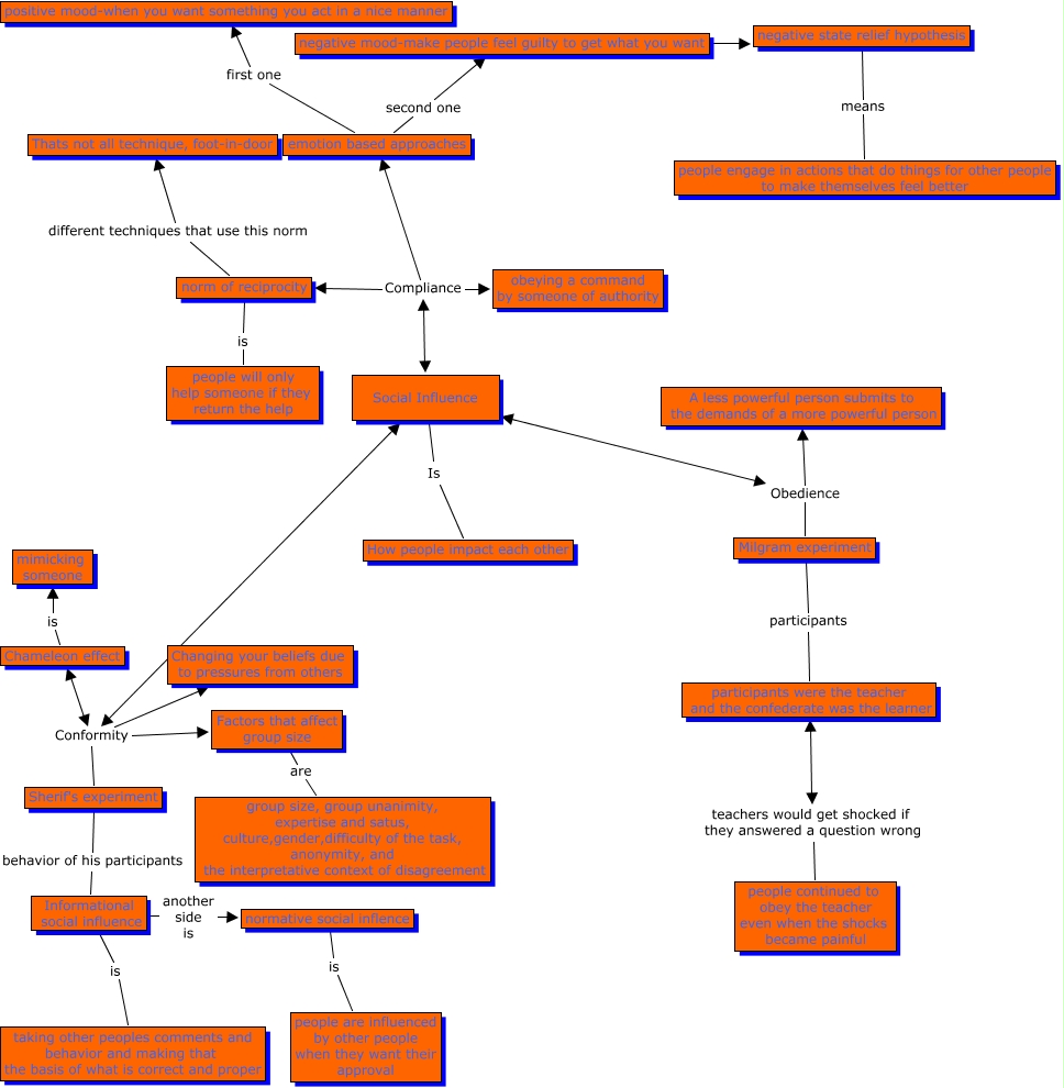 This Concept Map, created with IHMC CmapTools, has information related to: Social Influence, Social Influence Compliance obeying a command by someone of authority, Social Influence Compliance emotion based approaches, norm of reciprocity different techniques that use this norm Thats not all technique, foot-in-door, Social Influence Conformity Factors that affect group size, Social Influence Obedience Milgram experiment, emotion based approaches second one negative mood-make people feel guilty to get what you want, negative mood-make people feel guilty to get what you want ???? negative state relief hypothesis, Informational social influence another side is normative social inflence, Social Influence Is How people impact each other, Sherif's experiment behavior of his participants Informational social influence, Milgram experiment participants participants were the teacher and the confederate was the learner, norm of reciprocity is people will only help someone if they return the help, Factors that affect group size are group size, group unanimity, expertise and satus, culture,gender,difficulty of the task, anonymity, and the interpretative context of disagreement, Chameleon effect is mimicking someone, Social Influence Conformity Sherif's experiment, normative social inflence is people are influenced by other people when they want their approval, Social Influence Compliance norm of reciprocity, Social Influence Conformity Changing your beliefs due to pressures from others, Social Influence Conformity Chameleon effect, negative state relief hypothesis means people engage in actions that do things for other people to make themselves feel better