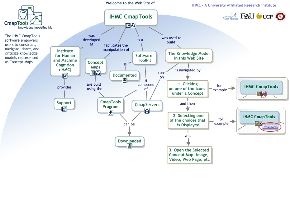 This Concept Map, created with IHMC CmapTools, has information related to: CmapTools - Home Page Cmap, CmapTools Program can be Downloaded, The Knowledge Model in this Web Site is navigated by 1. Clicking on one of the icons under a Concept, Software Toolkit is composed of CmapTools Program, Institute for Human and Machine Cognition (IHMC) provides Support, 1. Clicking on one of the icons under a Concept and then 2. Selecting one of the choices that is Displayed, The Knowledge Model in this Web Site runs on CmapServers, CmapServers can be Downloaded, Software Toolkit is Documented, IHMC CmapTools is a Software Toolkit, IHMC CmapTools was used to build The Knowledge Model in this Web Site, Software Toolkit is composed of CmapServers, IHMC CmapTools facilitates the manipulation of Concept Maps, 1. Clicking on one of the icons under a Concept for example, 2. Selecting one of the choices that is Displayed will 3. Open the Selected Concept Map, Image, Video, Web Page, etc, 2. Selecting one of the choices that is Displayed for example, Concept Maps are built using the CmapTools Program, IHMC CmapTools was developed at Institute for Human and Machine Cognition (IHMC)