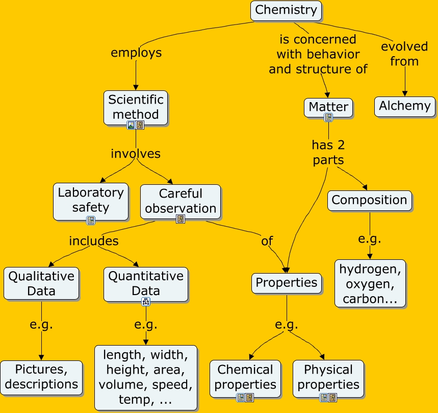 This Concept Map, created with IHMC CmapTools, has information related to: Unit 01 - The Science of Chemistry, Properties e.g. Physical properties, Careful observation of Properties, Properties e.g. Chemical properties, Qualitative Data e.g. Pictures, descriptions, Quantitative Data e.g. length, width, height, area, volume, speed, temp, ..., Matter has 2 parts Properties, Careful observation includes Quantitative Data, Chemistry evolved from Alchemy, Composition e.g. hydrogen, oxygen, carbon..., Scientific method involves Laboratory safety, Chemistry is concerned with behavior and structure of Matter, Matter has 2 parts Composition, Careful observation includes Qualitative Data, Chemistry employs Scientific method, Scientific method involves Careful observation