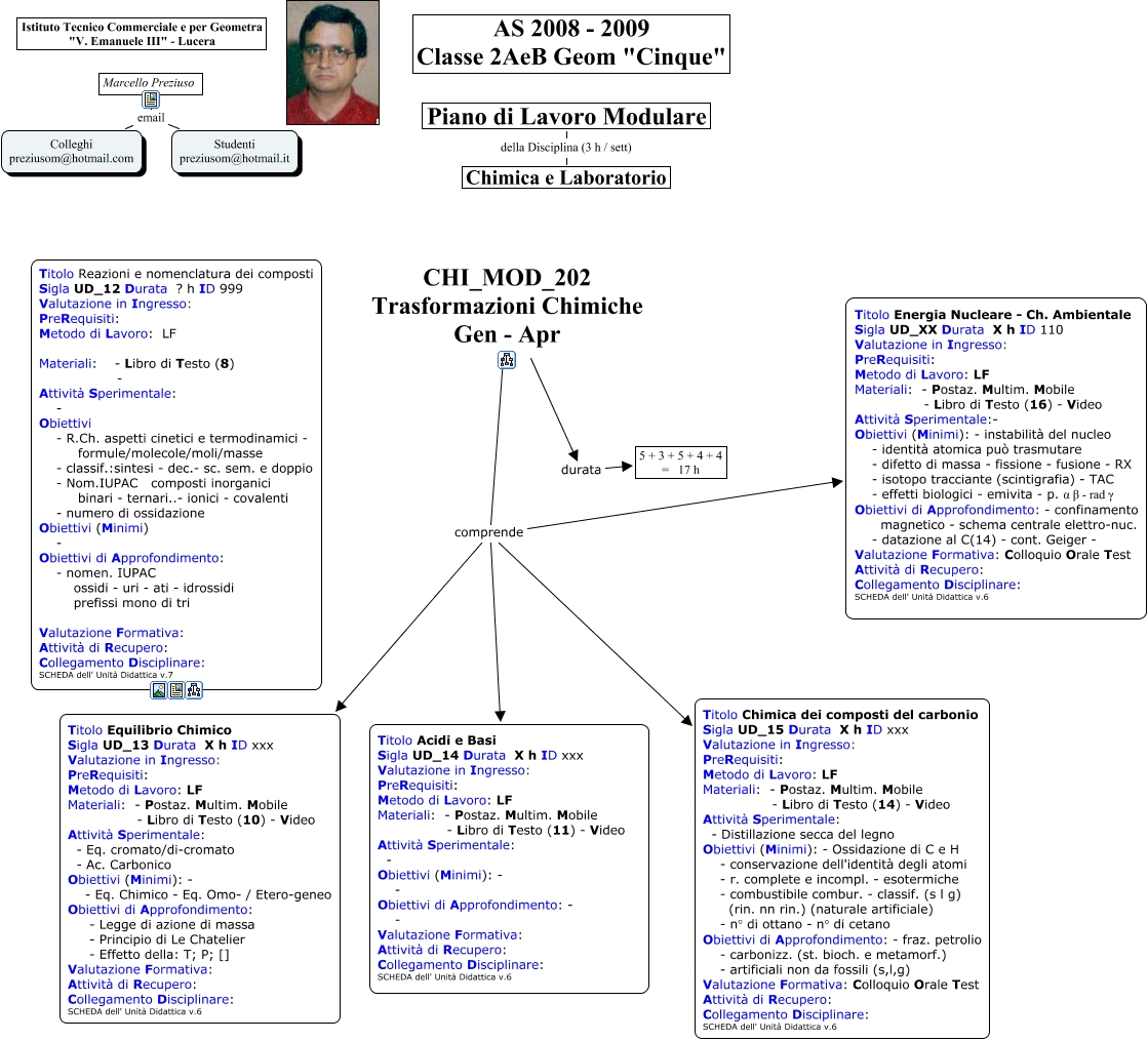Questa Cmap, creata con IHMC CmapTools, contiene informazioni relative a: CHI_MOD_202 Trasformazioni Chimiche, Marcello Preziuso email Colleghi preziusom@hotmail.com, CHI_MOD_202 Trasformazioni Chimiche Gen - Apr comprende Titolo Equilibrio Chimico Sigla UD_13 Durata X h ID xxx Valutazione in Ingresso: PreRequisiti: Metodo di Lavoro: LF Materiali: - Postaz. Multim. Mobile - Libro di Testo (10) - Video Attività Sperimentale: - Eq. cromato/di-cromato - Ac. Carbonico Obiettivi (Minimi): - - Eq. Chimico - Eq. Omo- / Etero-geneo Obiettivi di Approfondimento: - Legge di azione di massa - Principio di Le Chatelier - Effetto della: T; P; [] Valutazione Formativa: Attività di Recupero: Collegamento Disciplinare: SCHEDA dell' Unità Didattica v.6, CHI_MOD_202 Trasformazioni Chimiche Gen - Apr comprende Titolo Energia Nucleare - Ch. Ambientale Sigla UD_XX Durata X h ID 110 Valutazione in Ingresso: PreRequisiti: Metodo di Lavoro: LF Materiali: - Postaz. Multim. Mobile - Libro di Testo (16) - Video Attività Sperimentale:- Obiettivi (Minimi): - instabilità del nucleo - identità atomica può trasmutare - difetto di massa - fissione - fusione - RX - isotopo tracciante (scintigrafia) - TAC - effetti biologici - emivita - p. α β - rad γ Obiettivi di Approfondimento: - confinamento magnetico - schema centrale elettro-nuc. - datazione al C(14) - cont. Geiger - Valutazione Formativa: Colloquio Orale Test Attività di Recupero: Collegamento Disciplinare: SCHEDA dell' Unità Didattica v.6, CHI_MOD_202 Trasformazioni Chimiche Gen - Apr durata 5 + 3 + 5 + 4 + 4 = 17 h, CHI_MOD_202 Trasformazioni Chimiche Gen - Apr comprende Titolo Chimica dei composti del carbonio Sigla UD_15 Durata X h ID xxx Valutazione in Ingresso: PreRequisiti: Metodo di Lavoro: LF Materiali: - Postaz. Multim. Mobile - Libro di Testo (14) - Video Attività Sperimentale: - Distillazione secca del legno Obiettivi (Minimi): - Ossidazione di C e H - conservazione dell'identità degli atomi - r. complete e incompl. - esotermiche - combustibile combur. - classif. (s l g) (rin. nn rin.) (naturale artificiale) - n° di ottano - n° di cetano Obiettivi di Approfondimento: - fraz. petrolio - carbonizz. (st. bioch. e metamorf.) - artificiali non da fossili (s,l,g) Valutazione Formativa: Colloquio Orale Test Attività di Recupero: Collegamento Disciplinare: SCHEDA dell' Unità Didattica v.6, CHI_MOD_202 Trasformazioni Chimiche Gen - Apr comprende Titolo Acidi e Basi Sigla UD_14 Durata X h ID xxx Valutazione in Ingresso: PreRequisiti: Metodo di Lavoro: LF Materiali: - Postaz. Multim. Mobile - Libro di Testo (11) - Video Attività Sperimentale: - Obiettivi (Minimi): - - Obiettivi di Approfondimento: - - Valutazione Formativa: Attività di Recupero: Collegamento Disciplinare: SCHEDA dell' Unità Didattica v.6, Marcello Preziuso email Studenti preziusom@hotmail.it, Piano di Lavoro Modulare della Disciplina (3 h / sett) Chimica e Laboratorio