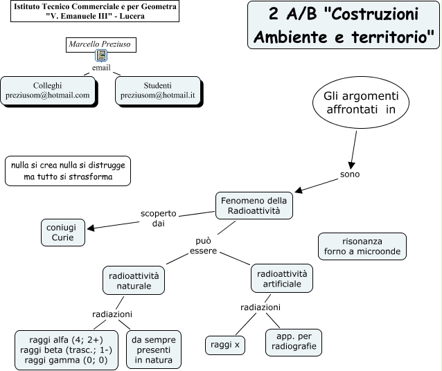 Questa Cmap, creata con IHMC CmapTools, contiene informazioni relative a: 2A-B G Set, Fenomeno della Radioattività scoperto dai coniugi Curie, Gli argomenti affrontati in sono Fenomeno della Radioattività, radioattività naturale radiazioni raggi alfa (4; 2+) raggi beta (trasc.; 1-) raggi gamma (0; 0), radioattività artificiale radiazioni app. per radiografie, Fenomeno della Radioattività può essere radioattività artificiale, Marcello Preziuso email Colleghi preziusom@hotmail.com, radioattività naturale radiazioni da sempre presenti in natura, radioattività artificiale radiazioni raggi x, Fenomeno della Radioattività può essere radioattività naturale, Marcello Preziuso email Studenti preziusom@hotmail.it