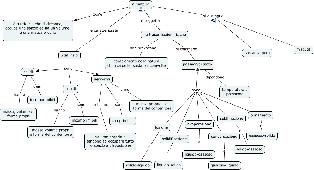 Questa Cmap, creata con IHMC CmapTools, contiene informazioni relative a: la materia, la materia si distingue miscugli, passaggidi stato sono solidificazione, Stati fisici sono aeriformi, la materia si distingue sostanza pura, aeriformi sono comprimibili, sublimazione è solido-gassoso, liquidi hanno massa,volume propri e forma del contenitore, passaggidi stato sono condensazione, la materia è soggetta ha trasormazioni fisiche, aeriformi hanno massa propria, e forma del contenitore, aeriformi non hanno volume proprio e tendono ad occupare tutto lo spazio a disposizione, passaggidi stato sono fusione, condensazione è gassoso-liquido, la materia Cos'è é tuutto cio che ci circonda, occupa uno spazio ed ha un volume e una massa propria, solidi sono incomprimibili, Stati fisici sono solidi, solidificazione è liquido-solido, ha trasormazioni fisiche non provocano cambiamenti nella natura chimica delle sostanze coinvolte, fusione è solido-liquido, passaggidi stato sono sublimazione