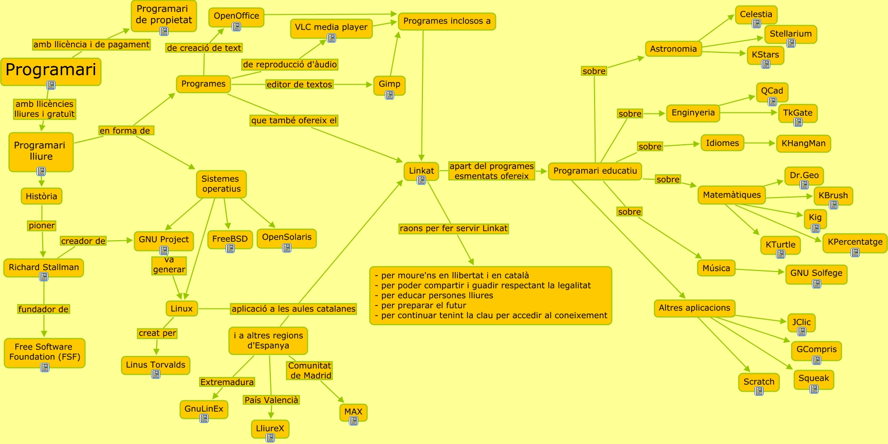 Aquest mapa conceptual conté informació relacionada amb: El programari lliure (Helena Prim), Astronomia ???? KStars, Programari educatiu sobre Idiomes, Enginyeria ???? QCad, Linkat raons per fer servir Linkat - per moure'ns en llibertat i en català - per poder compartir i guadir respectant la legalitat - per educar persones lliures - per preparar el futur - per continuar tenint la clau per accedir al coneixement, Sistemes operatius ???? OpenSolaris, VLC media player ???? Programes inclosos a, Programari lliure en forma de Programes, Programari educatiu sobre Música, Programes inclosos a ???? Linkat, Altres aplicacions ???? Squeak, Programes de reproducció d'àudio VLC media player, Linux creat per Linus Torvalds, Sistemes operatius ???? Linux, Matemàtiques ???? Dr.Geo, Matemàtiques ???? KBrush, Matemàtiques ???? KTurtle, Linux aplicació a les aules catalanes i a altres regions d'Espanya, Altres aplicacions ???? GCompris, Altres aplicacions ???? JClic, Matemàtiques ???? KPercentatge