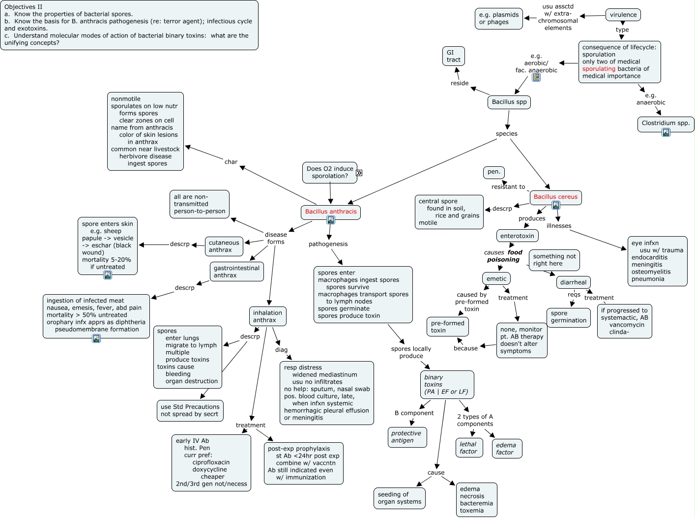 This Concept Map, created with IHMC CmapTools, has information related to: Bacteriology 5 G+ bacilli aerobes bacillus, Bacillus cereus illnesses eye infxn usu w/ trauma endocarditis meningitis osteomyelitis pneumonia, inhalation anthrax treatment early IV Ab hist. Pen curr pref: ciprofloxacin doxycycline cheaper 2nd/3rd gen not/necess, binary toxins (PA | EF or LF) cause seeding of organ systems, because it's an aerobic bacteria O2 doesn't induce sporulation Bacillus anthracis, virulence type consequence of lifecycle: sporulation only two of medical sporulating bacteria of medical importance, Bacillus anthracis pathogenesis spores enter macrophages ingest spores spores survive macrophages transport spores to lymph nodes spores germinate spores produce toxin, inhalation anthrax descrp spores enter lungs migrate to lymph multiple produce toxins toxins cause bleeding organ destruction, Bacillus cereus descrp central spore found in soil, rice and grains motile, binary toxins (PA | EF or LF) 2 types of A components lethal factor, binary toxins (PA | EF or LF) 2 types of A components edema factor, Bacillus cereus resistant to pen., Bacillus spp species Bacillus anthracis, emetic caused by pre-formed toxin pre-formed toxin, consequence of lifecycle: sporulation only two of medical sporulating bacteria of medical importance e.g. anaerobic Clostridium spp., none, monitor pt. AB therapy doesn't alter symptoms because pre-formed toxin, consequence of lifecycle: sporulation only two of medical sporulating bacteria of medical importance e.g. aerobic/ fac. anaerobic Bacillus spp, inhalation anthrax descrp use Std Precautions not spread by secrt, cutaneous anthrax descrp spore enters skin e.g. sheep papule -> vesicle -> eschar (black wound) mortality 5-20% if untreated, diarrheal treatment if progressed to systemactic, AB vancomycin clinda-, binary toxins (PA | EF or LF) B component protective antigen