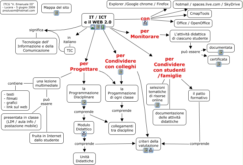 Questa Cmap, creata con IHMC CmapTools, contiene informazioni relative a: Home Page, la Programmazione Disciplinare comprende collegamenti tra discipline, Modulo Didattico comprende criteri della valutazione, una lezione multimediale contiene - testi - filmati - grafici - link sul web, la Programmazione Disciplinare comprende Modulo Didattico, L'attività didattica di ciascuno studente può essere documentata, IT / ICT e il WEB 2.0 per Progettare una lezione multimediale, TIC significa Tecnologie dell' Informazione e della Comunicazione, una lezione multimediale può essere fruita in Internet dallo studente, Modulo Didattico comprende Unità Didattiche, IT / ICT e il WEB 2.0 con Explorer /Google chrome / Firefox, IT / ICT e il WEB 2.0 per Condividere con colleghi criteri della valutazione, IT / ICT e il WEB 2.0 con hotmail / spaces.live.com / SkyDrive, IT / ICT e il WEB 2.0 per Condividere con colleghi la Progammazione di ogni classe, L'attività didattica di ciascuno studente può essere certificata, il patto formativo comprende criteri della valutazione, IT / ICT e il WEB 2.0 per Condividere con studenti /famiglie il patto formativo, una lezione multimediale può essere presentata in classe (LIM / aula info / postazione mobile), IT / ICT e il WEB 2.0 con Office / OpenOffice, IT / ICT e il WEB 2.0 per Progettare la Progammazione di ogni classe, IT / ICT e il WEB 2.0 con CmapTools