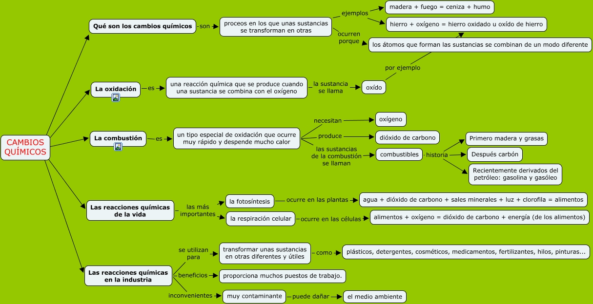 Este Cmap, tiene información relacionada con: Cambios químicos, una reacción química que se produce cuando una sustancia se combina con el oxígeno la sustancia se llama oxído, La combustión es un tipo especial de oxidación que ocurre muy rápido y despende mucho calor, transformar unas sustancias en otras diferentes y útiles como plásticos, detergentes, cosméticos, medicamentos, fertilizantes, hilos, pinturas..., un tipo especial de oxidación que ocurre muy rápido y despende mucho calor produce dióxido de carbono, CAMBIOS QUÍMICOS ???? Qué son los cambios químicos, la fotosíntesis ocurre en las plantas agua + dióxido de carbono + sales minerales + luz + clorofila = alimentos, un tipo especial de oxidación que ocurre muy rápido y despende mucho calor las sustancias de la combustión se llaman combustibles, Las reacciones químicas en la industria beneficios proporciona muchos puestos de trabajo., combustibles historia Después carbón, Las reacciones químicas en la industria inconvenientes muy contaminante, oxído por ejemplo hierro + oxígeno = hierro oxidado u oxído de hierro, Las reacciones químicas de la vida las más importantes la respiración celular, La oxidación es una reacción química que se produce cuando una sustancia se combina con el oxígeno, Las reacciones químicas en la industria se utilizan para transformar unas sustancias en otras diferentes y útiles, proceos en los que unas sustancias se transforman en otras ejemplos madera + fuego = ceniza + humo, Qué son los cambios químicos son proceos en los que unas sustancias se transforman en otras, CAMBIOS QUÍMICOS ???? La combustión, la respiración celular ocurre en las células alimentos + oxígeno = dióxido de carbono + energía (de los alimentos), combustibles historia Primero madera y grasas, Las reacciones químicas de la vida las más importantes la fotosíntesis