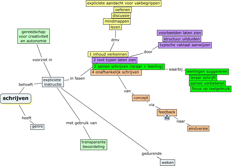 Deze Concept Map heeft informatie gerelateerd aan: schrijven, concept via feedback, expliciete instructie met gebruik van transparante beoordeling, feedback naar eindversie, 3 samen schrijven (leraar + leerling) waarbij leerlingen suggereren, expliciete instructie gedurende weken, schrijven heeft genre, expliciete instructie in fasen 1 inhoud verkennen, 1 inhoud verkennen dmv lezen, discussie ???? oefenen, schrijven behoeft expliciete instructie, 4 onafhankelijk schrijven van concept, discussie ???? oefenen, expliciete instructie voorziet in gereedschap voor creativiteit en autonomie, 2 text typen laten zien door voorbeelden laten zien