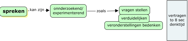 Deze Concept Map heeft informatie gerelateerd aan: spreken, spreken kan zijn onnderzoekend/ experimenterend, onnderzoekend/ experimenterend zoals vragen stellen