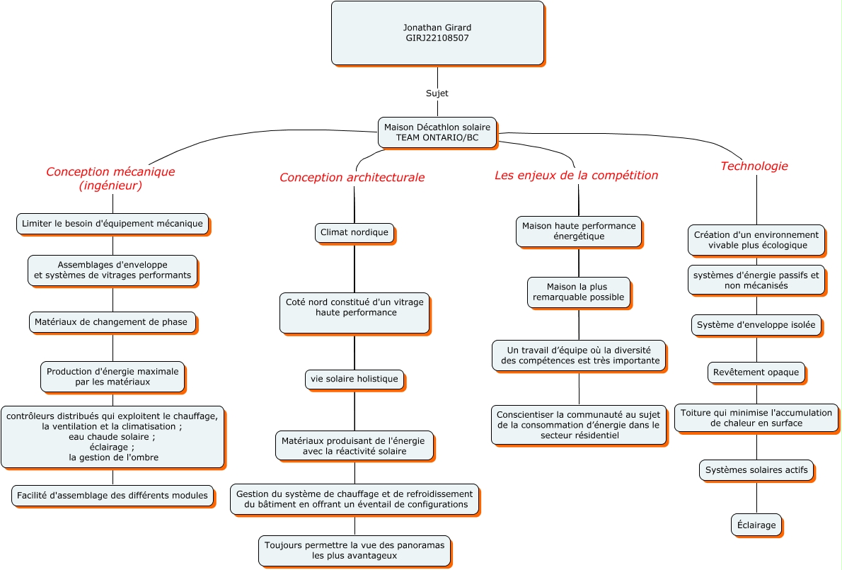 Cette carte de concepts créée avec IHMC CmapTools traite de: Carte conceptuelle OntarioBC.cmap, Maison Décathlon solaire TEAM ONTARIO/BC Conception architecturale Gestion du système de chauffage et de refroidissement du bâtiment en offrant un éventail de configurations, Maison Décathlon solaire TEAM ONTARIO/BC Les enjeux de la compétition Un travail d’équipe où la diversité des compétences est très importante, Maison Décathlon solaire TEAM ONTARIO/BC Conception mécanique (ingénieur) Production d'énergie maximale par les matériaux, Maison Décathlon solaire TEAM ONTARIO/BC Les enjeux de la compétition Conscientiser la communauté au sujet de la consommation d’énergie dans le secteur résidentiel, Maison Décathlon solaire TEAM ONTARIO/BC Conception architecturale Matériaux produisant de l'énergie avec la réactivité solaire, Maison Décathlon solaire TEAM ONTARIO/BC Technologie Revêtement opaque, Maison Décathlon solaire TEAM ONTARIO/BC Conception mécanique (ingénieur) Facilité d'assemblage des différents modules, Maison Décathlon solaire TEAM ONTARIO/BC Les enjeux de la compétition Maison la plus remarquable possible, Maison Décathlon solaire TEAM ONTARIO/BC Les enjeux de la compétition Maison haute performance énergétique, Maison Décathlon solaire TEAM ONTARIO/BC Conception architecturale vie solaire holistique, Maison Décathlon solaire TEAM ONTARIO/BC Technologie systèmes d'énergie passifs et non mécanisés, Maison Décathlon solaire TEAM ONTARIO/BC Technologie Système d'enveloppe isolée, Maison Décathlon solaire TEAM ONTARIO/BC Technologie Systèmes solaires actifs, Maison Décathlon solaire TEAM ONTARIO/BC Conception architecturale Coté nord constitué d'un vitrage haute performance, Maison Décathlon solaire TEAM ONTARIO/BC Conception architecturale Toujours permettre la vue des panoramas les plus avantageux, Maison Décathlon solaire TEAM ONTARIO/BC Conception mécanique (ingénieur) Assemblages d'enveloppe et systèmes de vitrages performants, Maison Décathlon solaire TEAM ONTARIO/BC Technologie Éclairage, Maison Décathlon solaire TEAM ONTARIO/BC Conception architecturale Climat nordique, Maison Décathlon solaire TEAM ONTARIO/BC Technologie Création d'un environnement vivable plus écologique, Maison Décathlon solaire TEAM ONTARIO/BC Conception mécanique (ingénieur) contrôleurs distribués qui exploitent le chauffage, la ventilation et la climatisation ; eau chaude solaire ; éclairage ; la gestion de l'ombre