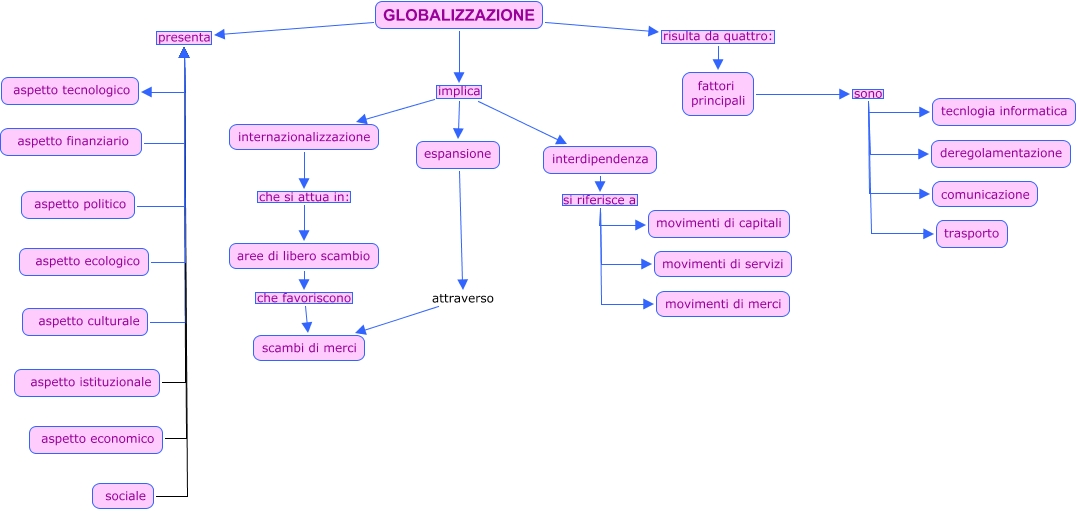 Questa Cmap, creata con IHMC CmapTools, contiene informazioni relative a: globalizzazione 1 adelfi coppola, aree di libero scambio che favoriscono scambi di merci, GLOBALIZZAZIONE implica espansione, aspetto culturale presenta aspetto tecnologico, interdipendenza si riferisce a movimenti di merci, aspetto economico presenta aspetto tecnologico, sociale presenta aspetto tecnologico, fattori principali sono trasporto, aspetto finanziario presenta aspetto tecnologico, GLOBALIZZAZIONE presenta aspetto tecnologico, internazionalizzazione che si attua in: aree di libero scambio, interdipendenza si riferisce a movimenti di capitali, fattori principali sono comunicazione, fattori principali sono tecnlogia informatica, GLOBALIZZAZIONE implica internazionalizzazione, fattori principali sono deregolamentazione, interdipendenza si riferisce a movimenti di servizi, espansione attraverso scambi di merci, aspetto ecologico presenta aspetto tecnologico, GLOBALIZZAZIONE risulta da quattro: fattori principali, aspetto politico presenta aspetto tecnologico