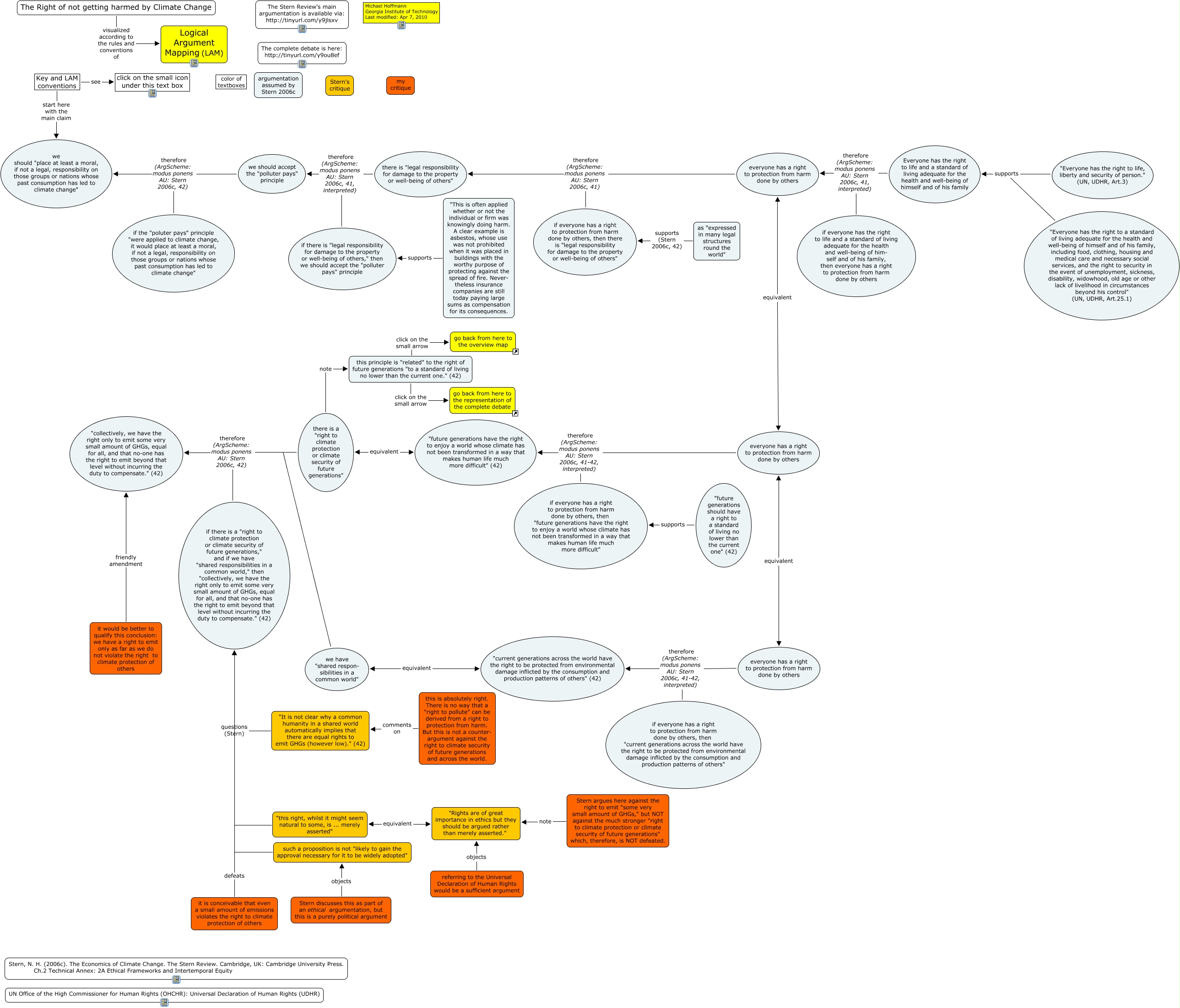 This Concept Map, created with IHMC CmapTools, has information related to: rights-approach-in-climate-ethics, there is a "right to climate protection or climate security of future generations" therefore (ArgScheme: modus ponens AU: Stern 2006c, 42) "collectively, we have the right only to emit some very small amount of GHGs, equal for all, and that no-one has the right to emit beyond that level without incurring the duty to compensate." (42), Stern argues here against the right to emit "some very small amount of GHGs," but NOT against the much stronger "right to climate protection or climate security of future generations" which, therefore, is NOT defeated. note "Rights are of great importance in ethics but they should be argued rather than merely asserted.", if there is a "right to climate protection or climate security of future generations," and if we have "shared responsibilities in a common world," then "collectively, we have the right only to emit some very small amount of GHGs, equal for all, and that no-one has the right to emit beyond that level without incurring the duty to compensate." (42) therefore (ArgScheme: modus ponens AU: Stern 2006c, 42) "collectively, we have the right only to emit some very small amount of GHGs, equal for all, and that no-one has the right to emit beyond that level without incurring the duty to compensate." (42), "It is not clear why a common humanity in a shared world automatically implies that there are equal rights to emit GHGs (however low)." (42) questions (Stern) if there is a "right to climate protection or climate security of future generations," and if we have "shared responsibilities in a common world," then "collectively, we have the right only to emit some very small amount of GHGs, equal for all, and that no-one has the right to emit beyond that level without incurring the duty to compensate." (42), if the "poluter pays" principle "were applied to climate change, it would place at least a moral, if not a legal, responsibility on those groups or nations whose past consumption has led to climate change" therefore (ArgScheme: modus ponens AU: Stern 2006c, 42) we should "place at least a moral, if not a legal, responsibility on those groups or nations whose past consumption has led to climate change", if everyone has a right to protection from harm done by others, then "future generations have the right to enjoy a world whose climate has not been transformed in a way that makes human life much more difficult" therefore (ArgScheme: modus ponens AU: Stern 2006c, 41-42, interpreted) "future generations have the right to enjoy a world whose climate has not been transformed in a way that makes human life much more difficult" (42), if everyone has a right to protection from harm done by others, then there is "legal responsibility for damage to the property or well-being of others" therefore (ArgScheme: modus ponens AU: Stern 2006c, 41) there is "legal responsibility for damage to the property or well-being of others", "this right, whilst it might seem natural to some, is ... merely asserted" questions (Stern) if there is a "right to climate protection or climate security of future generations," and if we have "shared responsibilities in a common world," then "collectively, we have the right only to emit some very small amount of GHGs, equal for all, and that no-one has the right to emit beyond that level without incurring the duty to compensate." (42), it would be better to qualify this conclusion: we have a right to emit only as far as we do not violate the right to climate protection of others friendly amendment "collectively, we have the right only to emit some very small amount of GHGs, equal for all, and that no-one has the right to emit beyond that level without incurring the duty to compensate." (42), this is absolutely right. There is no way that a "right to pollute" can be derived from a right to protection from harm. But this is not a counter- argument against the right to climate security of future generations and across the world. comments on "It is not clear why a common humanity in a shared world automatically implies that there are equal rights to emit GHGs (however low)." (42), everyone has a right to protection from harm done by others therefore (ArgScheme: modus ponens AU: Stern 2006c, 41) there is "legal responsibility for damage to the property or well-being of others", "This is often applied whether or not the individual or firm was knowingly doing harm. A clear example is asbestos, whose use was not prohibited when it was placed in buildings with the worthy purpose of protecting against the spread of fire. Never- theless insurance companies are still today paying large sums as compensation for its consequences. supports if there is "legal responsibility for damage to the property or well-being of others," then we should accept the "polluter pays" principle, if there is "legal responsibility for damage to the property or well-being of others," then we should accept the "polluter pays" principle therefore (ArgScheme: modus ponens AU: Stern 2006c, 41, interpreted) we should accept the "polluter pays" principle, everyone has a right to protection from harm done by others therefore (ArgScheme: modus ponens AU: Stern 2006c, 41-42, interpreted) "future generations have the right to enjoy a world whose climate has not been transformed in a way that makes human life much more difficult" (42), there is a "right to climate protection or climate security of future generations" note this principle is "related" to the right of future generations "to a standard of living no lower than the current one." (42), Stern discusses this as part of an ethical argumentation, but this is a purely political argument objects such a proposition is not "likely to gain the approval necessary for it to be widely adopted", if everyone has a right to protection from harm done by others, then "current generations across the world have the right to be protected