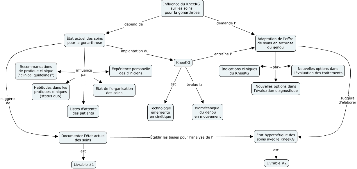 Cette carte de concepts créée avec IHMC CmapTools traite de: KneeKG2, État actuel des soins pour la gonarthrose implantation du KneeKG, Influence du KneeKG sur les soins pour la gonarthrose demande l' Adaptation de l'offre de soins en arthrose du genou, État actuel des soins pour la gonarthrose influencé par Expérience personelle des cliniciens, Influence du KneeKG sur les soins pour la gonarthrose dépend de État actuel des soins pour la gonarthrose, Documenter l'état actuel des soins est Livrable #1, KneeKG est Technologie émergente en cinétique, Adaptation de l'offre de soins en arthrose du genou suggère d'élaborer État hypothétique des soins avec le KneeKG, État actuel des soins pour la gonarthrose influencé par Habitudes dans les pratiques cliniques (status quo), Adaptation de l'offre de soins en arthrose du genou par Nouvelles options dans l'évaluation diagnostique, KneeKG entraîne l' Adaptation de l'offre de soins en arthrose du genou, Documenter l'état actuel des soins Établir les bases pour l'analyse de l' État hypothétique des soins avec le KneeKG, Adaptation de l'offre de soins en arthrose du genou par Indications cliniques du KneeKG, État actuel des soins pour la gonarthrose influencé par Listes d'attente des patients, État actuel des soins pour la gonarthrose influencé par État de l'organisation des soins, État hypothétique des soins avec le KneeKG est Livrable #2, État actuel des soins pour la gonarthrose influencé par Recommandations de pratique clinique ("clinical guidelines"), État actuel des soins pour la gonarthrose suggère de Documenter l'état actuel des soins, KneeKG évalue la Biomécanique du genou en mouvement, Adaptation de l'offre de soins en arthrose du genou par Nouvelles options dans l'évaluation des traitements