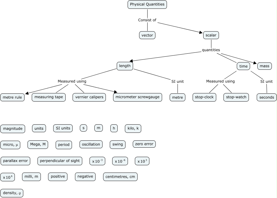 This Concept Map, created with IHMC CmapTools, has information related to: Physical Quantities, scalar quantities mass, Physical Quantities Consist of vector, length Measured using measuring tape, length SI unit metre, scalar quantities length, time Measured using stop-clock, scalar quantities time, length Measured using micrometer screwgauge, time Measured using stop-watch, length Measured using vernier calipers, Physical Quantities Consist of scalar, time SI unit seconds, length Measured using metre rule