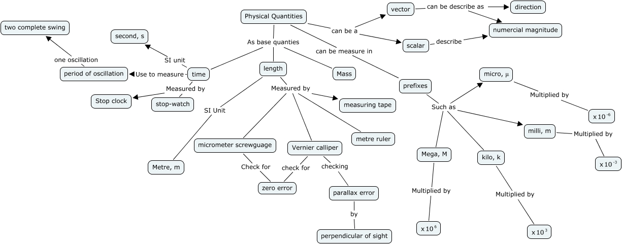 This Concept Map, created with IHMC CmapTools, has information related to: Physical Quantities, length Measured by Vernier calliper, vector can be describe as direction, Physical Quantities As base quanties length, prefixes Such as kilo, k, parallax error by perpendicular of sight, length Measured by metre ruler, vector can be describe as numercial magnitude, kilo, k Multiplied by <math xmlns="http://www.w3.org/1998/Math/MathML"> <mrow> <mtext> x </mtext> <mmultiscripts> <mtext> 10 </mtext> <none/> <mtext> 3 </mtext> </mmultiscripts> </mrow> </math>, Physical Quantities can be a scalar, micrometer screwguage Check for zero error, prefixes Such as Mega, M, scalar describe numercial magnitude, Vernier calliper check for zero error, length Measured by micrometer screwguage, Physical Quantities can be measure in prefixes, Mega, M Multiplied by <math xmlns="http://www.w3.org/1998/Math/MathML"> <mrow> <mtext> x </mtext> <mmultiscripts> <mtext> 10 </mtext> <none/> <mtext> 6 </mtext> </mmultiscripts> </mrow> </math>, length SI Unit Metre, m, time SI unit second, s, time Measured by Stop clock, micro, μ Multiplied by <math xmlns="http://www.w3.org/1998/Math/MathML"> <mrow> <mtext> x </mtext> <mmultiscripts> <mtext> 10 </mtext> <none/> <mtext> -6 </mtext> </mmultiscripts> </mrow> </math>