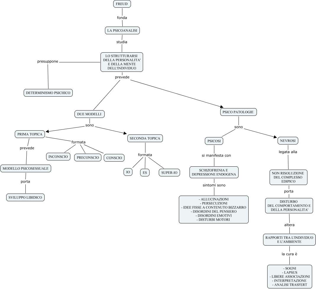 Questa Cmap, creata con IHMC CmapTools, contiene informazioni relative a: psicoanalisi, LO STRUTTURARSI DELLA PERSONALITA' E DELLA MENTE DELL'INDIVIDUO prevede DUE MODELLI, NEVROSI legata alla NON RISOLUZIONE DEL COMPLESSO EDIPICO, SECONDA TOPICA formata ES, LA PSICOANALISI studia LO STRUTTURARSI DELLA PERSONALITA' E DELLA MENTE DELL'INDIVIDUO, DISTURBO DEL COMPORTAMENTO E DELLA PERSONALITA' altera RAPPORTI TRA L'INDIVIDUO E L'AMBIENTE, PSICO PATOLOGIE sono PSICOSI, LO STRUTTURARSI DELLA PERSONALITA' E DELLA MENTE DELL'INDIVIDUO presuppone DETERMINISMO PSICHICO, MODELLO PSICOSESSUALE porta SVILUPPO LIBIDICO, PSICOSI si manifesta con SCHIZOFRENIA E DEPRESSIONE ENDOGENA, LO STRUTTURARSI DELLA PERSONALITA' E DELLA MENTE DELL'INDIVIDUO prevede PSICO PATOLOGIE, RAPPORTI TRA L'INDIVIDUO E L'AMBIENTE la cura è - SOGNI - LAPSUS - LIBERE ASSOCIAZIONI - INTERPRETAZIONE - ANALISI TRASFERT, SCHIZOFRENIA E DEPRESSIONE ENDOGENA sintomi sono - ALLUCINAZIONI - PERSECUZIONI - IDEE FISSE A CONTENUTO BIZZARRO - DISORDINI DEL PENSIERO - DISORDINI EMOTIVI - DISTURBI MOTORI, PRIMA TOPICA formata INCONSCIO, SECONDA TOPICA formata SUPER-IO, PRIMA TOPICA prevede MODELLO PSICOSESSUALE, PRIMA TOPICA formata PRECONSCIO, NON RISOLUZIONE DEL COMPLESSO EDIPICO porta DISTURBO DEL COMPORTAMENTO E DELLA PERSONALITA', FREUD fonda LA PSICOANALISI, PSICO PATOLOGIE sono NEVROSI, DUE MODELLI sono PRIMA TOPICA