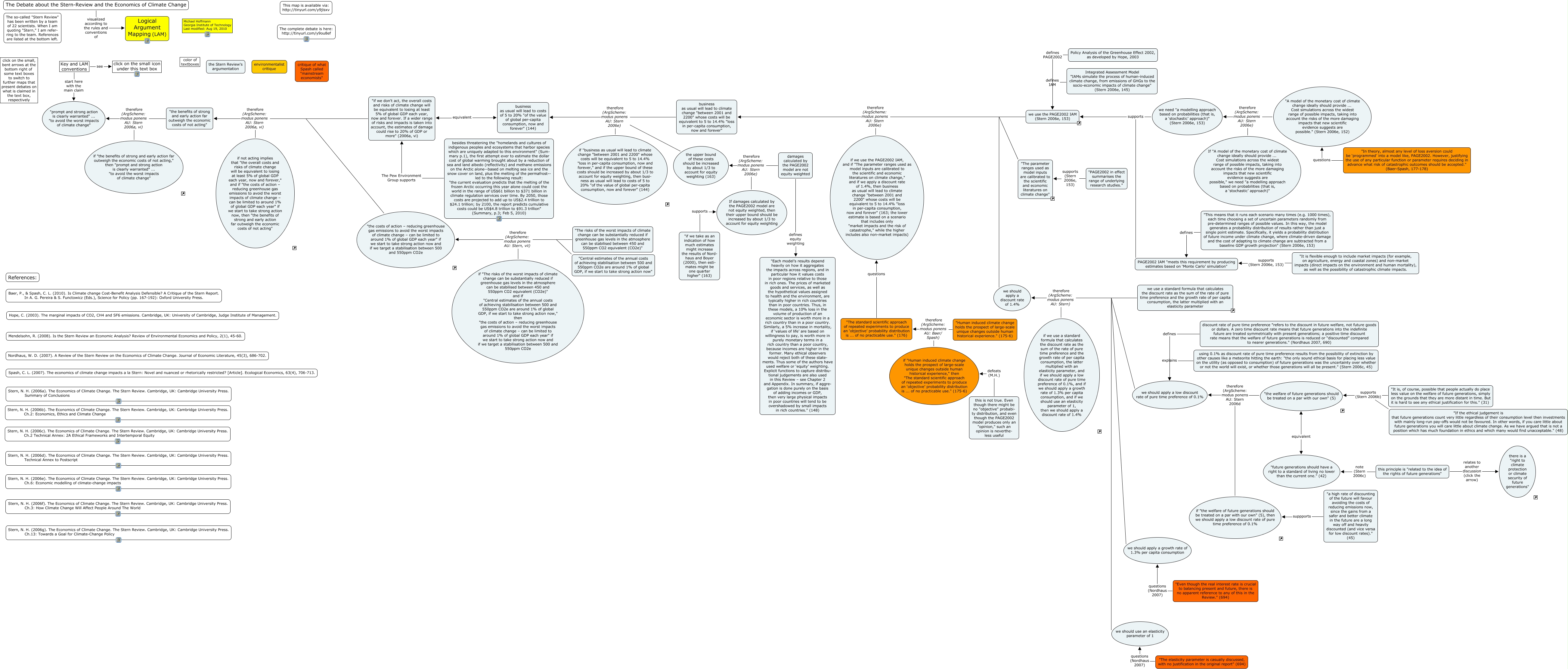 This Concept Map, created with IHMC CmapTools, has information related to: Stern-review-Climate-economics, we should apply a growth rate of 1.3% per capita consumption therefore (ArgScheme: modus ponens AU: Stern) we should apply a discount rate of 1.4%, "The risks of the worst impacts of climate change can be substantially reduced if greenhouse gas levels in the atmosphere can be stabilised between 450 and 550ppm CO2 equivalent (CO2e)" therefore (ArgScheme: modus ponens AU: Stern, vii) "the costs of action – reducing greenhouse gas emissions to avoid the worst impacts of climate change – can be limited to around 1% of global GDP each year" if we start to take strong action now and if we target a stabilisation between 500 and 550ppm CO2e, "PAGE2002 in effect summarises the range of underlying research studies." supports (Stern 2006e, 153) "The parameter ranges used as model inputs are calibrated to the scientific and economic literatures on climate change", "The elasticity parameter is casually discussed, with no justification in the original report" (694) questions (Nordhaus 2007) we should use an elasticity parameter of 1, damages calculated by the PAGE2002 model are not equity weighted defines equity weighting "Each model’s results depend heavily on how it aggregates the impacts across regions, and in particular how it values costs in poor regions relative to those in rich ones. The prices of marketed goods and services, as well as the hypothetical values assigned to health and the environment, are typically higher in rich countries than in poor countries. Thus, in these models, a 10% loss in the volume of production of an economic sector is worth more in a rich country than in a poor country. Similarly, a 5% increase in mortality, if ‘values of life’ are based on willingness to pay, is worth more in purely monetary terms in a rich country than a poor country, because incomes are higher in the former. Many ethical observers would reject both of these state- ments. Thus some of the authors have used welfare or ‘equity’ weighting. Explicit functions to capture distribu- tional judgements are also used in this Review – see Chapter 2 and Appendix. In summary, if aggre- gation is done purely on the basis of adding incomes or GDP, then very large physical impacts in poor countries will tend to be overshadowed by small impacts in rich countries." (148), if not acting implies that "the overall costs and risks of climate change will be equivalent to losing at least 5% of global GDP each year, now and forever," and if "the costs of action – reducing greenhouse gas emissions to avoid the worst impacts of climate change – can be limited to around 1% of global GDP each year" if we start to take strong action now, then "the benefits of strong and early action far outweigh the economic costs of not acting" therefore (ArgScheme: modus ponens AU: Stern 2006a, vi) "the benefits of strong and early action far outweigh the economic costs of not acting", this principle is "related to the idea of the rights of future generations" note (Stern 2006c) "future generations should have a right to a standard of living no lower than the current one." (42), Key and LAM conventions see click on the small icon under this text box, business as usual will lead to climate change "between 2001 and 2200" whose costs will be equivalent to 5 to 14.4% "loss in per-capita consumption, now and forever" therefore (ArgScheme: modus ponens AU: Stern 2006e) business as usual will lead to costs of 5 to 20% "of the value of global per-capita consumption, now and forever" (144), "It is, of course, possible that people actually do place less value on the welfare of future generations, simply on the grounds that they are more distant in time. But it is hard to see any ethical justification for this." (31) supports (Stern 2006b) "the welfare of future generations should be treated on a par with our own" (5), PAGE2002 IAM "meets this requirement by producing estimates based on ‘Monte Carlo’ simulation" supports we use the PAGE2002 IAM (Stern 2006e, 153), if "the benefits of strong and early action far outweigh the economic costs of not acting," then "prompt and strong action is clearly warranted" ... "to avoid the worst impacts of climate change" therefore (ArgScheme: modus ponens AU: Stern 2006a, vi) "prompt and strong action is clearly warranted" ... "to avoid the worst impacts of climate change", "Central estimates of the annual costs of achieving stabilisation between 500 and 550ppm CO2e are around 1% of global GDP, if we start to take strong action now" therefore (ArgScheme: modus ponens AU: Stern, vii) "the costs of action – reducing greenhouse gas emissions to avoid the worst impacts of climate change – can be limited to around 1% of global GDP each year" if we start to take strong action now and if we target a stabilisation between 500 and 550ppm CO2e, if "the welfare of future generations should be treated on a par with our own" (5), then we should apply a low discount rate of pure time preference of 0.1% therefore (ArgScheme: modus ponens AU: Stern 2006d we should apply a low discount rate of pure time preference of 0.1%, we should use an elasticity parameter of 1 therefore (ArgScheme: modus ponens AU: Stern) we should apply a discount rate of 1.4%, besides threatening the "homelands and cultures of indigenous peoples and ecosystems that harbor species which are uniquely adapted to this environment" (Sum- mary p.1), the first attempt ever to estimate the dollar cost of global warming brought about by a reduction of sea and land albedo (reflectivity) and methane emissions on the Arctic alone--based on melting sea ice and the snow cover on land, plus the melting of the permafrost-- led to the following result: "the current evaluation predicts that the melting of the frozen Arctic occurring this year alone could cost the world in the range of US$61 billion to $371 billion in climate regulation services 