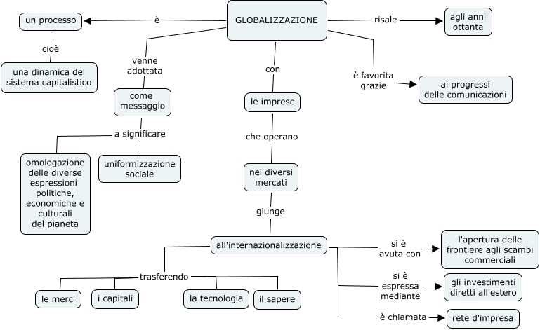 Questa Cmap, creata con IHMC CmapTools, contiene informazioni relative a: Globalizzazione 2 (Farinelli - Scuotto 5^ Bl), GLOBALIZZAZIONE con le imprese, GLOBALIZZAZIONE è un processo, GLOBALIZZAZIONE venne adottata come messaggio, GLOBALIZZAZIONE è favorita grazie ai progressi delle comunicazioni, all'internazionalizzazione trasferendo i capitali, all'internazionalizzazione trasferendo le merci, un processo cioè una dinamica del sistema capitalistico, all'internazionalizzazione è chiamata rete d'impresa, come messaggio a significare uniformizzazione sociale, GLOBALIZZAZIONE risale agli anni ottanta, all'internazionalizzazione si è avuta con l'apertura delle frontiere agli scambi commerciali, all'internazionalizzazione trasferendo la tecnologia, all'internazionalizzazione si è espressa mediante gli investimenti diretti all'estero, le imprese che operano nei diversi mercati, nei diversi mercati giunge all'internazionalizzazione, all'internazionalizzazione trasferendo il sapere, come messaggio a significare omologazione delle diverse espressioni politiche, economiche e culturali del pianeta