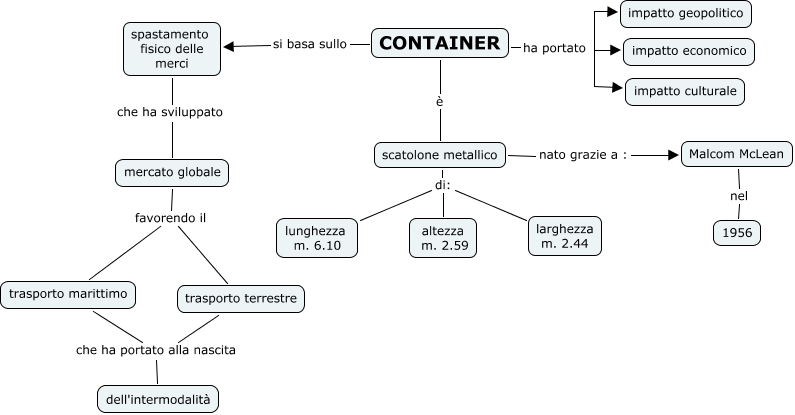Questa Cmap, creata con IHMC CmapTools, contiene informazioni relative a: container sparano buonanno, scatolone metallico di: larghezza m. 2.44, mercato globale favorendo il trasporto marittimo, trasporto marittimo che ha portato alla nascita dell'intermodalità, CONTAINER ha portato impatto culturale, mercato globale favorendo il trasporto terrestre, scatolone metallico nato grazie a : Malcom McLean, scatolone metallico di: altezza m. 2.59, scatolone metallico di: lunghezza m. 6.10, trasporto terrestre che ha portato alla nascita dell'intermodalità, spastamento fisico delle merci che ha sviluppato mercato globale, CONTAINER ha portato impatto economico, CONTAINER si basa sullo spastamento fisico delle merci, CONTAINER è scatolone metallico, CONTAINER ha portato impatto geopolitico, Malcom McLean nel 1956