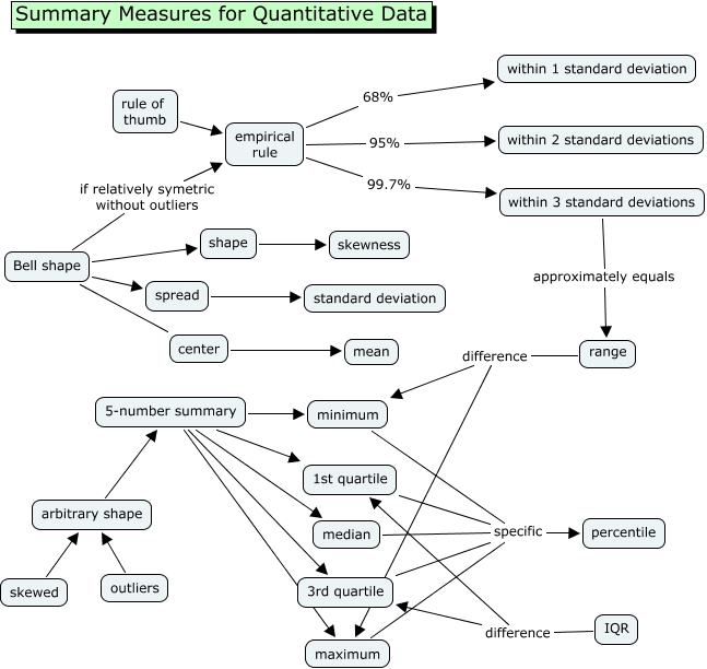 This Concept Map, created with IHMC CmapTools, has information related to: QuantitativeSummaries, shape skewness, Bell shape center, empirical rule 95% within 2 standard deviations, 5-number summary 1st quartile, Bell shape if relatively symetric without outliers empirical rule, outliers arbitrary shape, 5-number summary median, skewed arbitrary shape, 3rd quartile specific percentile, 5-number summary 3rd quartile, empirical rule 99.7% within 3 standard deviations, empirical rule 68% within 1 standard deviation, range difference maximum, Bell shape spread, 5-number summary minimum, maximum specific percentile, within 3 standard deviations approximately equals range, arbitrary shape 5-number summary, spread standard deviation, center mean