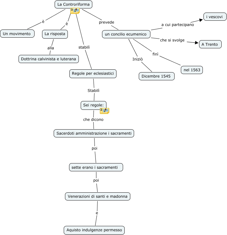 Questa Cmap, creata con IHMC CmapTools, contiene informazioni relative a: Cannizzaro_Pezzoni_ Fanari, Sacerdoti amministrazione i sacramenti poi sette erano i sacramenti, sette erano i sacramenti poi Venerazioni di santi e madonna, un concilio ecumenico a cui partecipano i vescovi, Venerazioni di santi e madonna e Aquisto indulgenze permesso, un concilio ecumenico che si svolge A Trento, La Controriforma prevede un concilio ecumenico, La risposta alla Dottrina calvinista e luterana, un concilio ecumenico Iniziò Dicembre 1545, un concilio ecumenico finì nel 1563, La Controriforma è La risposta, La Controriforma stabilì Regole per eclesiastici, Sei regole: che dicono Sacerdoti amministrazione i sacramenti, Regole per eclesiastici Stabilì Sei regole:, La Controriforma è Un movimento