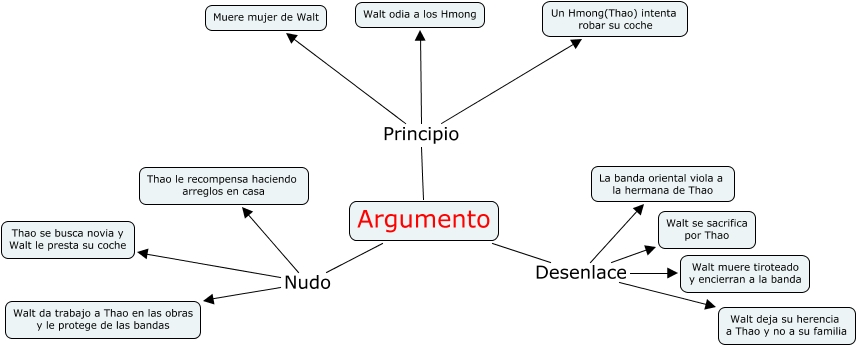 Este Cmap, tiene información relacionada con: submapa argumento, Argumento Desenlace Walt deja su herencia a Thao y no a su familia, Argumento Desenlace Walt muere tiroteado y encierran a la banda, Argumento Desenlace La banda oriental viola a la hermana de Thao, Argumento Principio Muere mujer de Walt, Argumento Nudo Thao se busca novia y Walt le presta su coche, Argumento Principio Un Hmong(Thao) intenta robar su coche, Argumento Nudo Thao le recompensa haciendo arreglos en casa, Argumento Desenlace Walt se sacrifica por Thao, Argumento Nudo Walt da trabajo a Thao en las obras y le protege de las bandas, Argumento Principio Walt odia a los Hmong