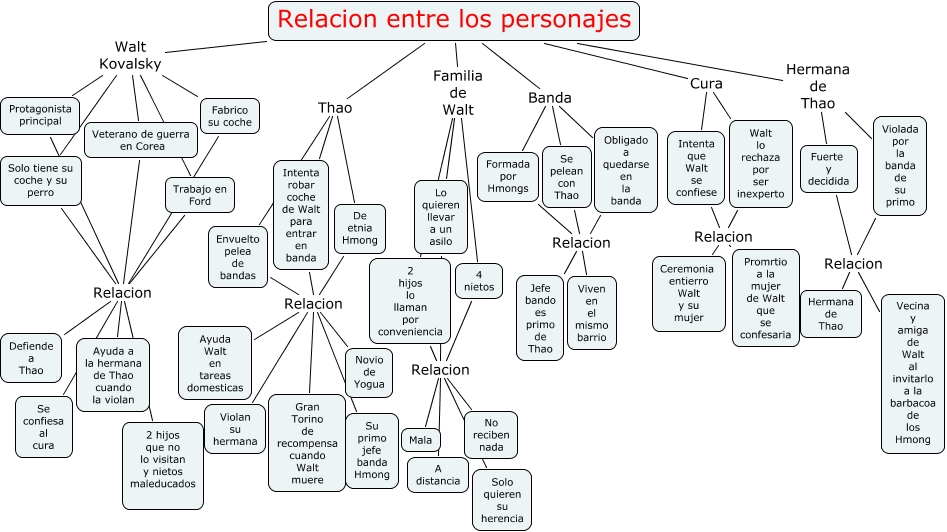 Este Cmap, tiene información relacionada con: submapa personajes, Formada por Hmongs Relacion Jefe bando es primo de Thao, Se pelean con Thao Relacion Jefe bando es primo de Thao, 2 hijos lo llaman por conveniencia Relacion Mala, Lo quieren llevar a un asilo Relacion Solo quieren su herencia, Fuerte y decidida Relacion Hermana de Thao, Intenta que Walt se confiese Relacion Promrtio a la mujer de Walt que se confesaria, Violada por la banda de su primo Relacion Hermana de Thao, Envuelto pelea de bandas Relacion Violan su hermana, Intenta robar coche de Walt para entrar en banda Relacion Gran Torino de recompensa cuando Walt muere, 2 hijos lo llaman por conveniencia Relacion A distancia, Protagonista principal Relacion Ayuda a la hermana de Thao cuando la violan, Obligado a quedarse en la banda Relacion Jefe bando es primo de Thao, Relacion entre los personajes Thao De etnia Hmong, Relacion entre los personajes Familia de Walt 4 nietos, Relacion entre los personajes Cura Intenta que Walt se confiese, Relacion entre los personajes Walt Kovalsky Protagonista principal, Trabajo en Ford Relacion Ayuda a la hermana de Thao cuando la violan, Envuelto pelea de bandas Relacion Su primo jefe banda Hmong, Relacion entre los personajes Walt Kovalsky Solo tiene su coche y su perro, 4 nietos Relacion Mala