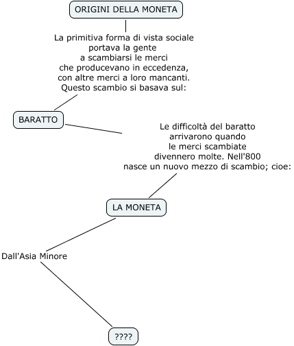 Questa Cmap, creata con IHMC CmapTools, contiene informazioni relative a: origini della moneta 1chiaro alessandro, ORIGINI DELLA MONETA La primitiva forma di vista sociale portava la gente a scambiarsi le merci che producevano in eccedenza, con altre merci a loro mancanti. Questo scambio si basava sul: BARATTO, BARATTO Le difficoltà del baratto arrivarono quando le merci scambiate divennero molte. Nell'800 nasce un nuovo mezzo di scambio; cioe: LA MONETA, LA MONETA Dall'Asia Minore ????