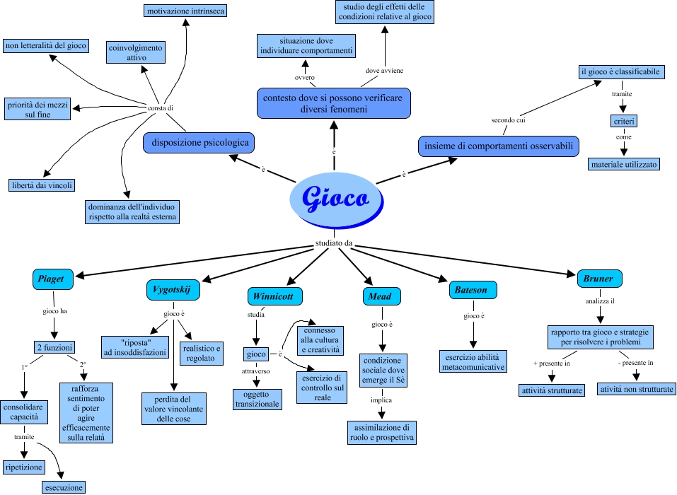 Questa Cmap, creata con IHMC CmapTools, contiene informazioni relative a: Il gioco cap.I, Mead gioco è condizione sociale dove emerge il Sè, Gioco studiato da Bateson, Vygotskij gioco è realistico e regolato, Gioco studiato da Mead, Gioco studiato da Winnicott, Gioco studiato da Bruner, Gioco studiato da Piaget, 2 funzioni 1° consolidare capacità, Gioco è insieme di comportamenti osservabili, Piaget gioco ha 2 funzioni, gioco è esercizio di controllo sul reale, disposizione psicologica consta di libertà dai vincoli, condizione sociale dove emerge il Sè implica assimilazione di ruolo e prospettiva, rapporto tra gioco e strategie per risolvere i problemi + presente in attività strutturate, Winnicott studia gioco, 2 funzioni 2° rafforza sentimento di poter agire efficacemente sulla relatà, disposizione psicologica consta di dominanza dell'individuo rispetto alla realtà esterna, rapporto tra gioco e strategie per risolvere i problemi - presente in atività non strutturate, gioco è connesso alla cultura e creatività, Bruner analizza il rapporto tra gioco e strategie per risolvere i problemi