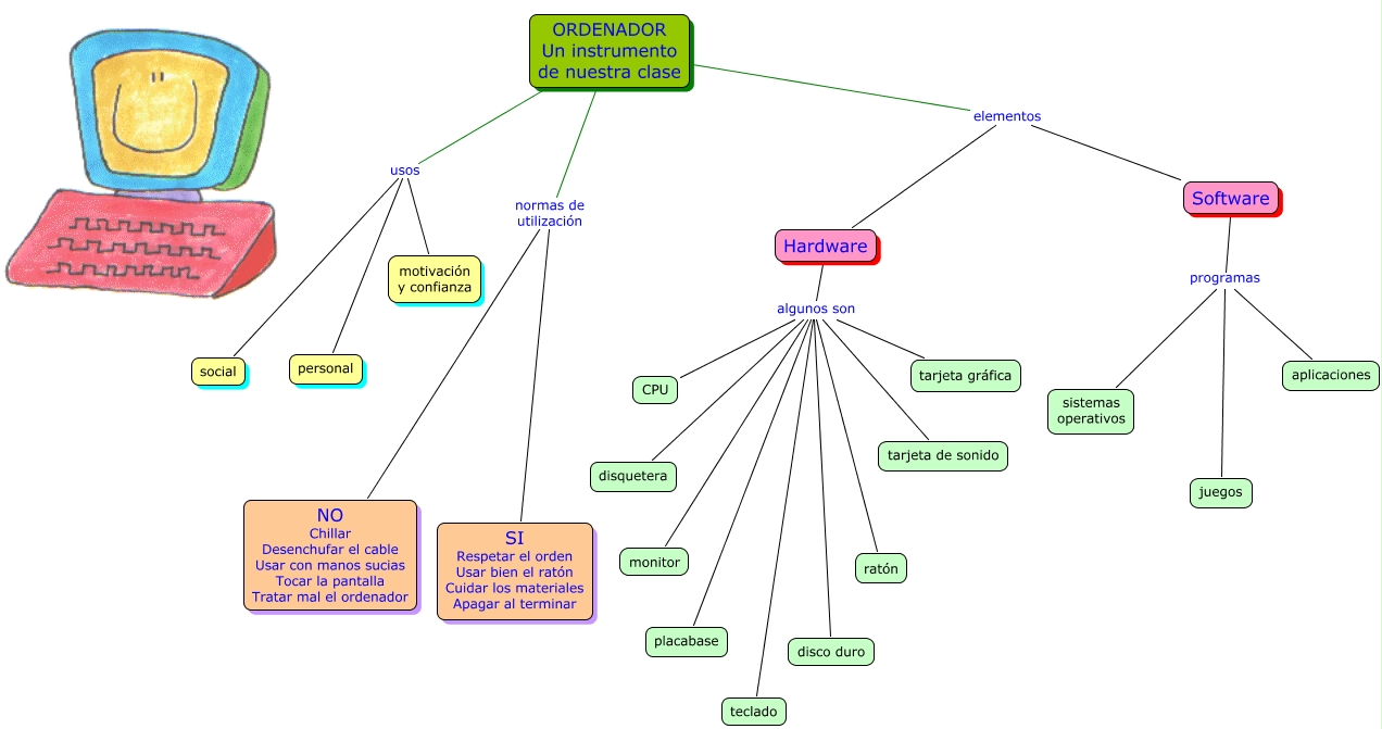 Este Cmap, tiene información relacionada con: ordenadorCmap, Software programas sistemas operativos, Hardware algunos son disquetera, Hardware algunos son monitor, ORDENADOR Un instrumento de nuestra clase elementos Hardware, ORDENADOR Un instrumento de nuestra clase normas de utilización NO Chillar Desenchufar el cable Usar con manos sucias Tocar la pantalla Tratar mal el ordenador, ORDENADOR Un instrumento de nuestra clase normas de utilización SI Respetar el orden Usar bien el ratón Cuidar los materiales Apagar al terminar, Hardware algunos son placabase, Hardware algunos son disco duro, Hardware algunos son tarjeta de sonido, Software programas aplicaciones, ORDENADOR Un instrumento de nuestra clase usos personal, Hardware algunos son ratón, ORDENADOR Un instrumento de nuestra clase usos motivación y confianza, ORDENADOR Un instrumento de nuestra clase usos social, Software programas juegos, Hardware algunos son teclado, Hardware algunos son CPU, Hardware algunos son tarjeta gráfica, ORDENADOR Un instrumento de nuestra clase elementos Software