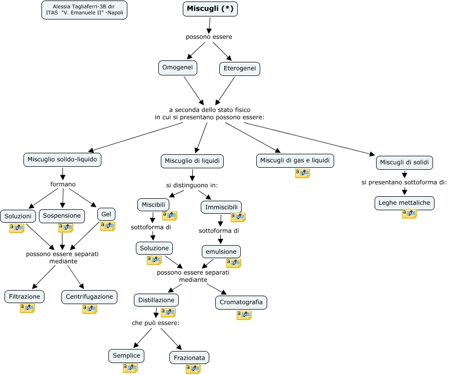 Questa Cmap, creata con IHMC CmapTools, contiene informazioni relative a: Miscugli-tagliaferri alessia 3Bd, Eterogenei a seconda dello stato fisico in cui si presentano possono essere: Miscugli di solidi, Eterogenei a seconda dello stato fisico in cui si presentano possono essere: Miscugli di gas e liquidi, Omogenei a seconda dello stato fisico in cui si presentano possono essere: Miscugli di solidi, Eterogenei a seconda dello stato fisico in cui si presentano possono essere: Miscuglio solido-liquido, Distillazione che può essere: Frazionata, Miscugli (*) possono essere Eterogenei, Distillazione che può essere: Semplice, Soluzione possono essere separati mediante Cromatografia, Miscugli (*) possono essere Omogenei, Omogenei a seconda dello stato fisico in cui si presentano possono essere: Miscuglio di liquidi, emulsione possono essere separati mediante Distillazione, emulsione possono essere separati mediante Cromatografia, Gel possono essere separati mediante Centrifugazione, Sospensione possono essere separati mediante Filtrazione, Miscibili sottoforma di Soluzione, Omogenei a seconda dello stato fisico in cui si presentano possono essere: Miscugli di gas e liquidi, Miscuglio solido-liquido formano Soluzioni, Soluzione possono essere separati mediante Distillazione, Miscuglio solido-liquido formano Gel, Gel possono essere separati mediante Filtrazione