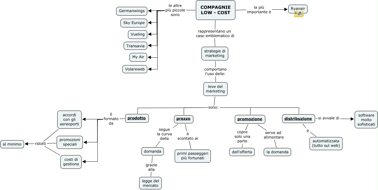 Questa Cmap, creata con IHMC CmapTools, contiene informazioni relative a: Compagnie low-cost (Scuotto - Farinelli), costi di gestione ridotti al minimo, COMPAGNIE LOW - COST le altre più piccole sono Sky Europe, COMPAGNIE LOW - COST le altre più piccole sono My Air, prodotto è formato da costi di gestione, prodotto è formato da promozioni speciali, leve del marketing sono: prezzo, COMPAGNIE LOW - COST la più importante è Ryanair, distribuzione si avvale di software molto sofisticati, domanda grazie alla legge del mercato, COMPAGNIE LOW - COST le altre più piccole sono Transavia, promozione copre solo una parte dell'offerta, prodotto è formato da accordi con gli aereoporti, promozione serve ad alimentare la domanda, COMPAGNIE LOW - COST le altre più piccole sono Volareweb, COMPAGNIE LOW - COST rappresentano un caso emblematico di strategie di marketing, leve del marketing sono: prodotto, prezzo è scontato ai primi passeggeri più fortunati, strategie di marketing comportano l'uso delle: leve del marketing, COMPAGNIE LOW - COST le altre più piccole sono Germanwings, accordi con gli aereoporti ridotti al minimo