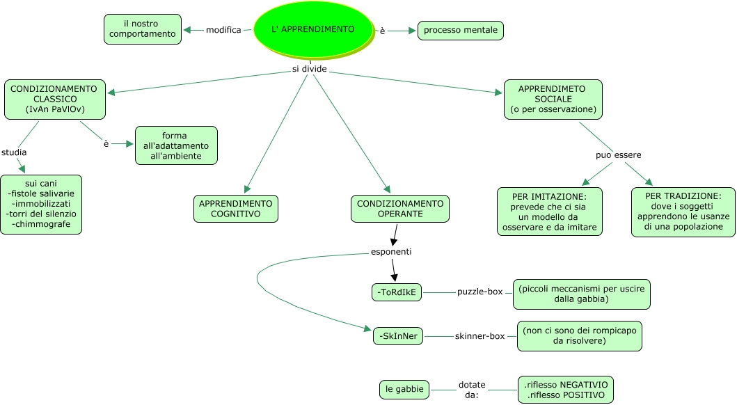 Questa Cmap, creata con IHMC CmapTools, contiene informazioni relative a: L' apprendimento, APPRENDIMETO SOCIALE (o per osservazione) puo essere PER IMITAZIONE: prevede che ci sia un modello da osservare e da imitare, (piccoli meccanismi per uscire dalla gabbia) puzzle-box -ToRdIkE, -SkInNer skinner-box (non ci sono dei rompicapo da risolvere), APPRENDIMETO SOCIALE (o per osservazione) puo essere PER TRADIZIONE: dove i soggetti apprendono le usanze di una popolazione, le gabbie dotate da: .riflesso NEGATIVIO .riflesso POSITIVO, CONDIZIONAMENTO CLASSICO (IvAn PaVlOv) è forma all'adattamento all'ambiente, L' APPRENDIMENTO si divide CONDIZIONAMENTO OPERANTE, L' APPRENDIMENTO si divide APPRENDIMENTO COGNITIVO, CONDIZIONAMENTO CLASSICO (IvAn PaVlOv) studia sui cani -fistole salivarie -immobilizzati -torri del silenzio -chimmografe, L' APPRENDIMENTO si divide CONDIZIONAMENTO CLASSICO (IvAn PaVlOv), L' APPRENDIMENTO si divide APPRENDIMETO SOCIALE (o per osservazione), L' APPRENDIMENTO è processo mentale, CONDIZIONAMENTO OPERANTE esponenti -SkInNer, CONDIZIONAMENTO OPERANTE esponenti -ToRdIkE, L' APPRENDIMENTO modifica il nostro comportamento