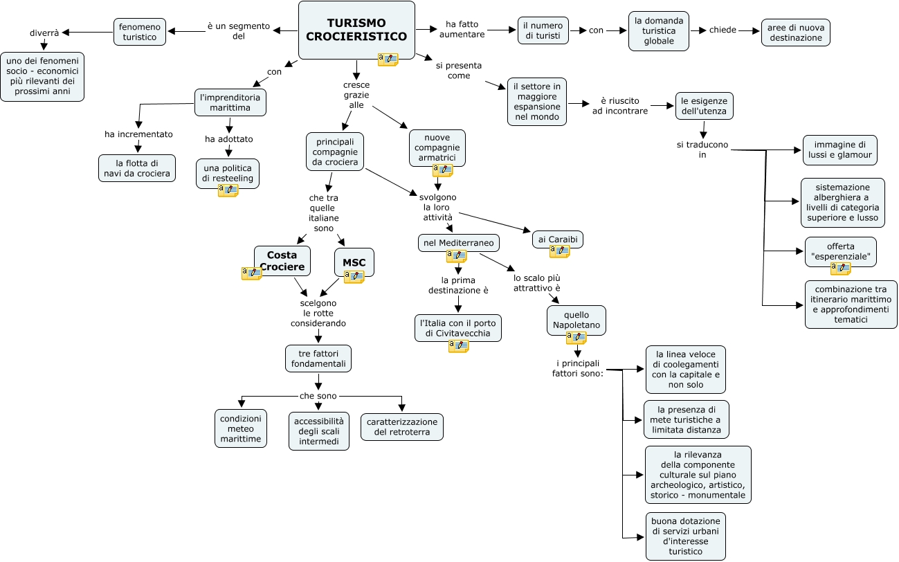 Questa Cmap, creata con IHMC CmapTools, contiene informazioni relative a: Turismo crocieristico (Scuotto - Farinelli), quello Napoletano i principali fattori sono: la linea veloce di coolegamenti con la capitale e non solo, MSC scelgono le rotte considerando tre fattori fondamentali, fenomeno turistico diverrà uno dei fenomeni socio - economici più rilevanti dei prossimi anni, la domanda turistica globale chiede aree di nuova destinazione, il numero di turisti con la domanda turistica globale, le esigenze dell'utenza si traducono in sistemazione alberghiera a livelli di categoria superiore e lusso, l'imprenditoria marittima ha incrementato la flotta di navi da crociera, quello Napoletano i principali fattori sono: la presenza di mete turistiche a limitata distanza, nel Mediterraneo lo scalo più attrattivo è quello Napoletano, le esigenze dell'utenza si traducono in immagine di lussi e glamour, le esigenze dell'utenza si traducono in offerta "esperenziale", tre fattori fondamentali che sono condizioni meteo marittime, il settore in maggiore espansione nel mondo è riuscito ad incontrare le esigenze dell'utenza, l'imprenditoria marittima ha adottato una politica di resteeling, TURISMO CROCIERISTICO con l'imprenditoria marittima, TURISMO CROCIERISTICO si presenta come il settore in maggiore espansione nel mondo, le esigenze dell'utenza si traducono in combinazione tra itinerario marittimo e approfondimenti tematici, principali compagnie da crociera svolgono la loro attività nel Mediterraneo, tre fattori fondamentali che sono caratterizzazione del retroterra, TURISMO CROCIERISTICO ha fatto aumentare il numero di turisti