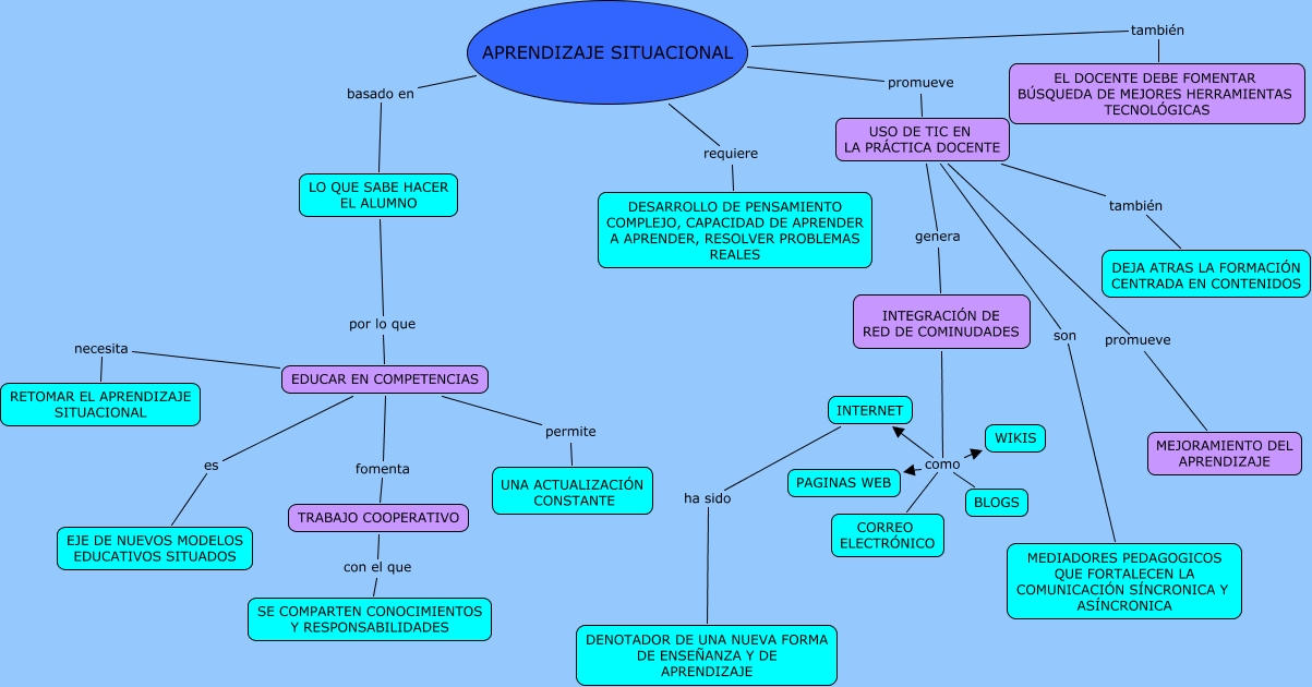 Este Cmap, tiene información relacionada con: APRENDIZAJE SITUACIONAL, USO DE TIC EN LA PRÁCTICA DOCENTE también DEJA ATRAS LA FORMACIÓN CENTRADA EN CONTENIDOS, INTEGRACIÓN DE RED DE COMINUDADES como CORREO ELECTRÓNICO, APRENDIZAJE SITUACIONAL requiere DESARROLLO DE PENSAMIENTO COMPLEJO, CAPACIDAD DE APRENDER A APRENDER, RESOLVER PROBLEMAS REALES, INTEGRACIÓN DE RED DE COMINUDADES como PAGINAS WEB, INTERNET ha sido DENOTADOR DE UNA NUEVA FORMA DE ENSEÑANZA Y DE APRENDIZAJE, EDUCAR EN COMPETENCIAS permite UNA ACTUALIZACIÓN CONSTANTE, USO DE TIC EN LA PRÁCTICA DOCENTE genera INTEGRACIÓN DE RED DE COMINUDADES, APRENDIZAJE SITUACIONAL basado en LO QUE SABE HACER EL ALUMNO, TRABAJO COOPERATIVO con el que SE COMPARTEN CONOCIMIENTOS Y RESPONSABILIDADES, LO QUE SABE HACER EL ALUMNO por lo que EDUCAR EN COMPETENCIAS, EDUCAR EN COMPETENCIAS es EJE DE NUEVOS MODELOS EDUCATIVOS SITUADOS, EDUCAR EN COMPETENCIAS fomenta TRABAJO COOPERATIVO, INTEGRACIÓN DE RED DE COMINUDADES como BLOGS, APRENDIZAJE SITUACIONAL también EL DOCENTE DEBE FOMENTAR BÚSQUEDA DE MEJORES HERRAMIENTAS TECNOLÓGICAS, USO DE TIC EN LA PRÁCTICA DOCENTE son MEDIADORES PEDAGOGICOS QUE FORTALECEN LA COMUNICACIÓN SÍNCRONICA Y ASÍNCRONICA, INTEGRACIÓN DE RED DE COMINUDADES como INTERNET, USO DE TIC EN LA PRÁCTICA DOCENTE promueve MEJORAMIENTO DEL APRENDIZAJE, EDUCAR EN COMPETENCIAS necesita RETOMAR EL APRENDIZAJE SITUACIONAL, APRENDIZAJE SITUACIONAL promueve USO DE TIC EN LA PRÁCTICA DOCENTE, INTEGRACIÓN DE RED DE COMINUDADES como WIKIS