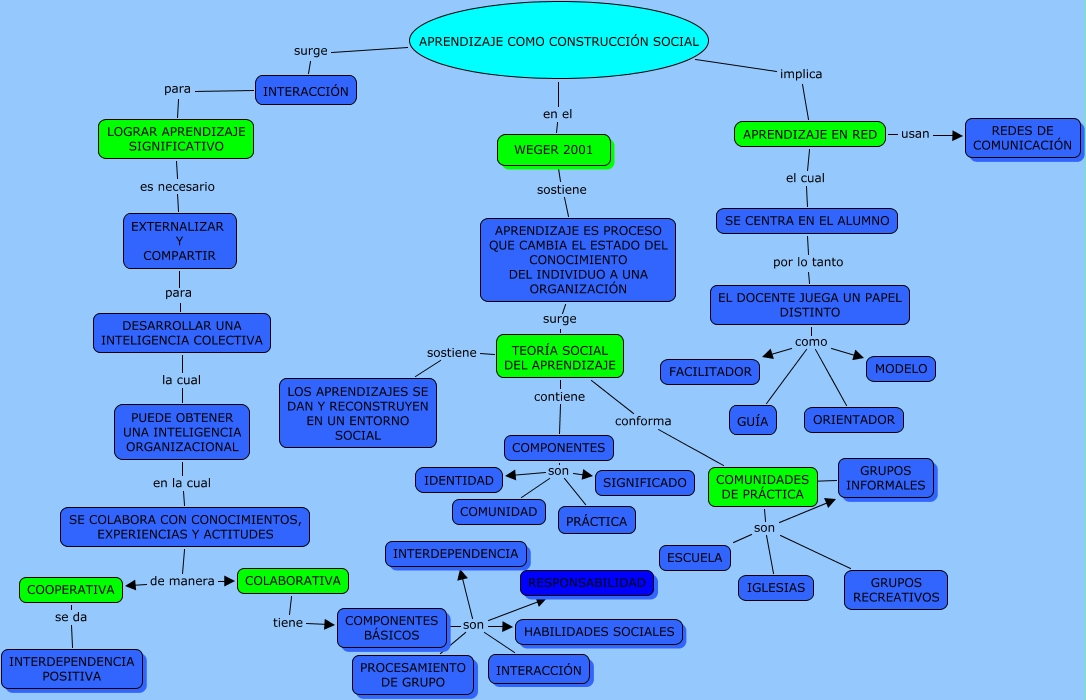Este Cmap, tiene información relacionada con: APRENDIZAJE COMO CONSTRUCCIÓN SOCIAL, SE COLABORA CON CONOCIMIENTOS, EXPERIENCIAS Y ACTITUDES de manera COOPERATIVA, EXTERNALIZAR Y COMPARTIR para DESARROLLAR UNA INTELIGENCIA COLECTIVA, COMPONENTES BÁSICOS son HABILIDADES SOCIALES, TEORÍA SOCIAL DEL APRENDIZAJE conforma COMUNIDADES DE PRÁCTICA, INTERACCIÓN para LOGRAR APRENDIZAJE SIGNIFICATIVO, DESARROLLAR UNA INTELIGENCIA COLECTIVA la cual PUEDE OBTENER UNA INTELIGENCIA ORGANIZACIONAL, COMPONENTES BÁSICOS son INTERACCIÓN, PUEDE OBTENER UNA INTELIGENCIA ORGANIZACIONAL en la cual SE COLABORA CON CONOCIMIENTOS, EXPERIENCIAS Y ACTITUDES, APRENDIZAJE EN RED el cual SE CENTRA EN EL ALUMNO, COMPONENTES son COMUNIDAD, APRENDIZAJE COMO CONSTRUCCIÓN SOCIAL implica APRENDIZAJE EN RED, COMPONENTES son IDENTIDAD, COOPERATIVA se da INTERDEPENDENCIA POSITIVA, COMUNIDADES DE PRÁCTICA son ESCUELA, COLABORATIVA tiene COMPONENTES BÁSICOS, TEORÍA SOCIAL DEL APRENDIZAJE contiene COMPONENTES, COMUNIDADES DE PRÁCTICA son GRUPOS INFORMALES, COMUNIDADES DE PRÁCTICA son IGLESIAS, EL DOCENTE JUEGA UN PAPEL DISTINTO como MODELO, LOGRAR APRENDIZAJE SIGNIFICATIVO es necesario EXTERNALIZAR Y COMPARTIR