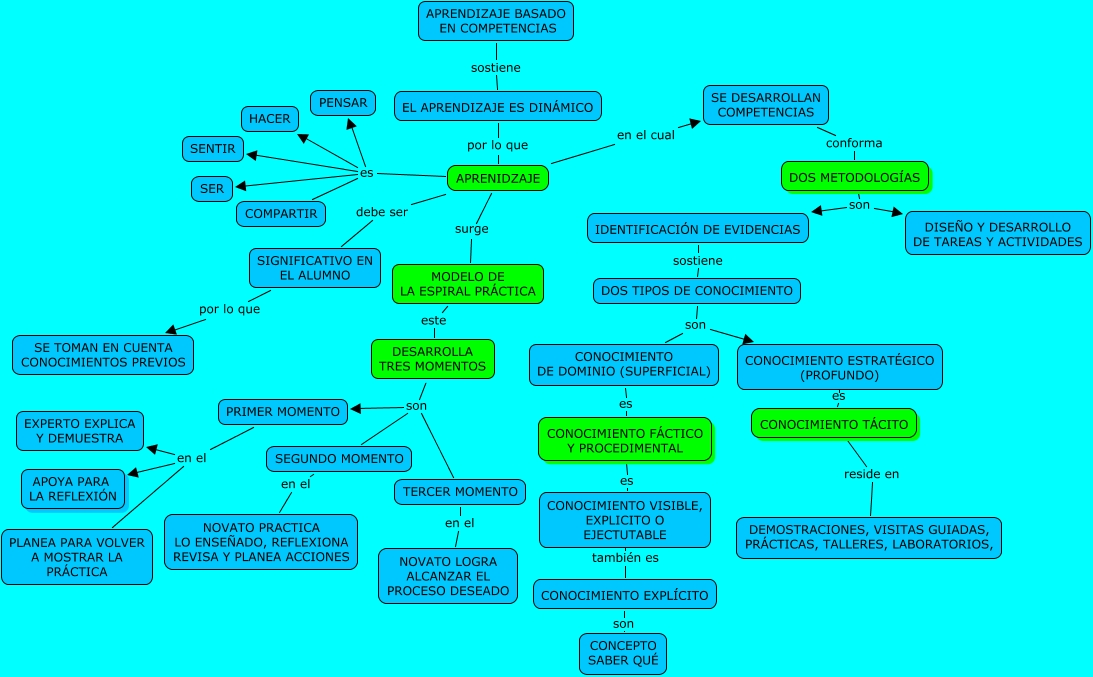 Este Cmap, tiene información relacionada con: APRENDIZAJE BASADO EN COMPETENCIAS, DOS METODOLOGÍAS son IDENTIFICACIÓN DE EVIDENCIAS, CONOCIMIENTO ESTRATÉGICO (PROFUNDO) es CONOCIMIENTO TÁCITO, APRENIDZAJE surge MODELO DE LA ESPIRAL PRÁCTICA, APRENIDZAJE debe ser SIGNIFICATIVO EN EL ALUMNO, TERCER MOMENTO en el NOVATO LOGRA ALCANZAR EL PROCESO DESEADO, SE DESARROLLAN COMPETENCIAS conforma DOS METODOLOGÍAS, DOS TIPOS DE CONOCIMIENTO son CONOCIMIENTO DE DOMINIO (SUPERFICIAL), APRENIDZAJE es HACER, SIGNIFICATIVO EN EL ALUMNO por lo que SE TOMAN EN CUENTA CONOCIMIENTOS PREVIOS, APRENIDZAJE es COMPARTIR, DESARROLLA TRES MOMENTOS son PRIMER MOMENTO, CONOCIMIENTO VISIBLE, EXPLICITO O EJECTUTABLE también es CONOCIMIENTO EXPLÍCITO, DESARROLLA TRES MOMENTOS son TERCER MOMENTO, APRENDIZAJE BASADO EN COMPETENCIAS sostiene EL APRENDIZAJE ES DINÁMICO, PRIMER MOMENTO en el EXPERTO EXPLICA Y DEMUESTRA, APRENIDZAJE es SER, DESARROLLA TRES MOMENTOS son SEGUNDO MOMENTO, APRENIDZAJE es PENSAR, APRENIDZAJE es SENTIR, IDENTIFICACIÓN DE EVIDENCIAS sostiene DOS TIPOS DE CONOCIMIENTO