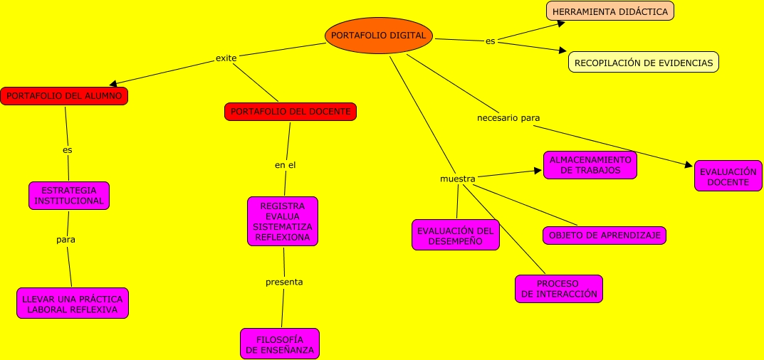 Este Cmap, tiene información relacionada con: PORTAFOLIO DIGITAL, REGISTRA EVALUA SISTEMATIZA REFLEXIONA presenta FILOSOFÍA DE ENSEÑANZA, PORTAFOLIO DIGITAL es HERRAMIENTA DIDÁCTICA, ESTRATEGIA INSTITUCIONAL para LLEVAR UNA PRÁCTICA LABORAL REFLEXIVA, PORTAFOLIO DIGITAL es RECOPILACIÓN DE EVIDENCIAS, PORTAFOLIO DIGITAL muestra PROCESO DE INTERACCIÓN, PORTAFOLIO DIGITAL necesario para EVALUACIÓN DOCENTE, PORTAFOLIO DIGITAL exite PORTAFOLIO DEL DOCENTE, PORTAFOLIO DIGITAL exite PORTAFOLIO DEL ALUMNO, PORTAFOLIO DEL DOCENTE en el REGISTRA EVALUA SISTEMATIZA REFLEXIONA, PORTAFOLIO DIGITAL muestra OBJETO DE APRENDIZAJE, PORTAFOLIO DIGITAL muestra ALMACENAMIENTO DE TRABAJOS, PORTAFOLIO DIGITAL muestra EVALUACIÓN DEL DESEMPEÑO, PORTAFOLIO DEL ALUMNO es ESTRATEGIA INSTITUCIONAL
