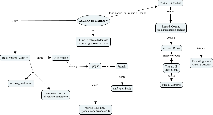 Questa Cmap, creata con IHMC CmapTools, contiene informazioni relative a: Acesa di Cralo v 1, Re di Spagna- Carlo V ha comprato i voti per diventare imperatore, Spagna vince prende D.Milano, (pone a capo francesco I), sacco di Roma finisce e segue Trattato di Barcellona, Lega di Cognac (alleanza antiasburgica) conseg. sacco di Roma, ASCESA DI CARLO V 1519 Re di Spagna- Carlo V, ASCESA DI CARLO V dopo guerra tra Francia e Spagna Trattato di Madrid, Trattato di Madrid segue Lega di Cognac (alleanza antiasburgica), ASCESA DI CARLO V è ultimo tentativo di dar vita ad una egemonia in Italia, sacco di Roma intanto Papa rifugiatio a Castel S.Angelo, Trattato di Barcellona segue Pace di Cambrai, D. di Milano conseg. Spagna, Re di Spagna- Carlo V ha impero grandissimo, Francia perde disfatta di Pavia, Spagna vs Francia, Re di Spagna- Carlo V vuole D. di Milano