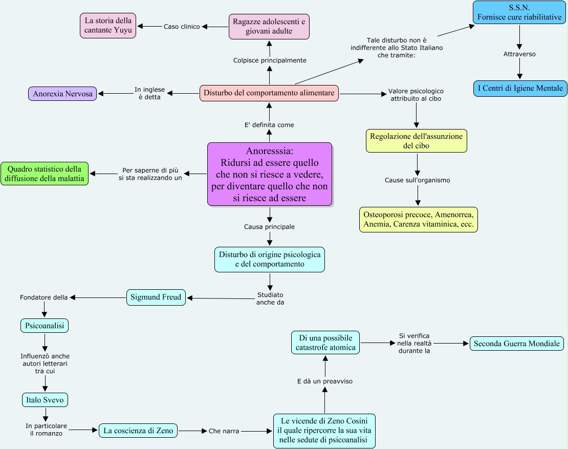 Questa Cmap, creata con IHMC CmapTools, contiene informazioni relative a: mappa tesina Micillo 5dir.cmap, Regolazione dell'assunzione del cibo Cause sull'organismo Osteoporosi precoce, Amenorrea, Anemia, Carenza vitaminica, ecc., La coscienza di Zeno Che narra Le vicende di Zeno Cosini il quale ripercorre la sua vita nelle sedute di psicoanalisi, Sigmund Freud Fondatore della Psicoanalisi, Disturbo del comportamento alimentare In inglese è detta Anorexia Nervosa, Disturbo di origine psicologica e del comportamento Studiato anche da Sigmund Freud, Ragazze adolescenti e giovani adulte Caso clinico La storia della cantante Yuyu, Anoresssia: Ridursi ad essere quello che non si riesce a vedere, per diventare quello che non si riesce ad essere Per saperne di più si sta realizzando un Quadro statistico della diffusione della malattia, S.S.N. Fornisce cure riabilitative Attraverso I Centri di Igiene Mentale, Le vicende di Zeno Cosini il quale ripercorre la sua vita nelle sedute di psicoanalisi E dà un preavviso Di una possibile catastrofe atomica, Disturbo del comportamento alimentare Valore psicologico attribuito al cibo Regolazione dell'assunzione del cibo, Italo Svevo In particolare il romanzo La coscienza di Zeno, Di una possibile catastrofe atomica Si verifica nella realtà durante la Seconda Guerra Mondiale, Anoresssia: Ridursi ad essere quello che non si riesce a vedere, per diventare quello che non si riesce ad essere Causa principale Disturbo di origine psicologica e del comportamento, Disturbo del comportamento alimentare Colpisce principalmente Ragazze adolescenti e giovani adulte, Disturbo del comportamento alimentare Tale disturbo non è indifferente allo Stato Italiano che tramite: S.S.N. Fornisce cure riabilitative, Anoresssia: Ridursi ad essere quello che non si riesce a vedere, per diventare quello che non si riesce ad essere E' definita come Disturbo del comportamento alimentare, Psicoanalisi Influenzò anche autori letterari tra cui Italo Svevo