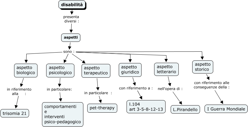 Questa Cmap, creata con IHMC CmapTools, contiene informazioni relative a: tesina disabilità Langella 5ed, aspetti sono : aspetto storico, aspetto storico con riferimento alle conseguenze della : I Guerra Mondiale, aspetti sono : aspetto terapeutico, disabilità presenta diversi : aspetti, aspetti sono : aspetto biologico, aspetti sono : aspetto letterario, aspetto psicologico in particolare: comportamenti e interventi psico-pedagogico, aspetti sono : aspetto psicologico, aspetto letterario nell'opera di : L.Pirandello, aspetto giuridico con riferimento a : l.104 art 3-5-8-12-13, aspetto biologico in riferimento alla : trisomia 21, aspetti sono : aspetto giuridico, aspetto terapeutico in particolare : pet-therapy