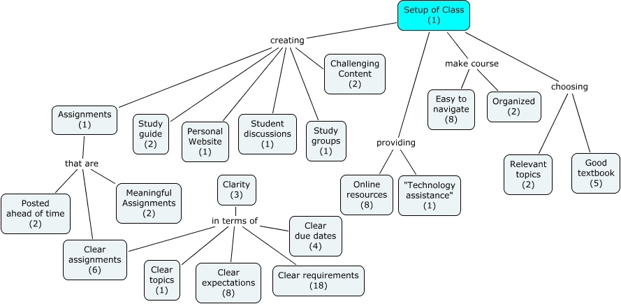 This Concept Map, created with IHMC CmapTools, has information related to: Setup, Setup of Class (1) creating Personal Website (1), Setup of Class (1) providing Online resources (8), Assignments (1) that are Posted ahead of time (2), Setup of Class (1) choosing Good textbook (5), Setup of Class (1) make course Easy to navigate (8), Setup of Class (1) choosing Relevant topics (2), Assignments (1) that are Clear assignments (6), Setup of Class (1) make course Organized (2), Setup of Class (1) creating Challenging Content (2), Setup of Class (1) creating Study guide (2), Setup of Class (1) providing "Technology assistance" (1), Setup of Class (1) creating Assignments (1), Clarity (3) in terms of Clear expectations (8), Clarity (3) in terms of Clear requirements (18), Assignments (1) that are Meaningful Assignments (2), Clarity (3) in terms of Clear assignments (6), Clarity (3) in terms of Clear due dates (4), Clarity (3) in terms of Clear topics (1), Setup of Class (1) creating Study groups (1), Setup of Class (1) creating Student discussions (1)