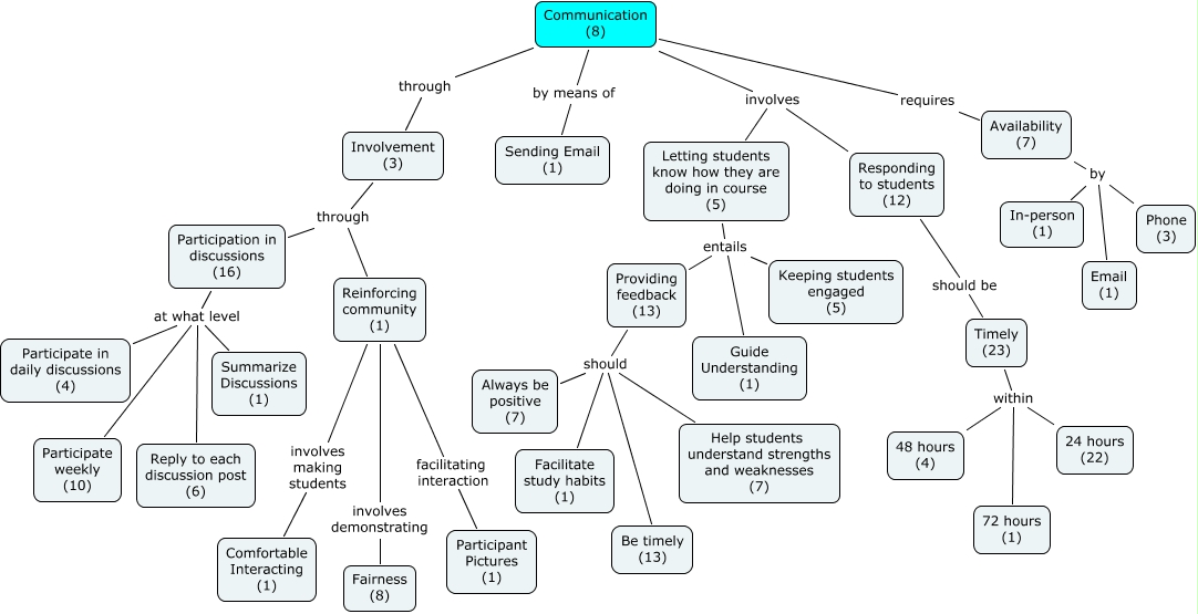 This Concept Map, created with IHMC CmapTools, has information related to: Communication, Providing feedback (13) should Facilitate study habits (1), Communication (8) by means of Sending Email (1), Providing feedback (13) should Be timely (13), Letting students know how they are doing in course (5) entails Guide Understanding (1), Timely (23) within 48 hours (4), Reinforcing community (1) involves demonstrating Fairness (8), Participation in discussions (16) at what level Reply to each discussion post (6), Letting students know how they are doing in course (5) entails Keeping students engaged (5), Responding to students (12) should be Timely (23), Communication (8) requires Availability (7), Participation in discussions (16) at what level Participate weekly (10), Communication (8) involves Responding to students (12), Participation in discussions (16) at what level Summarize Discussions (1), Communication (8) through Involvement (3), Providing feedback (13) should Always be positive (7), Reinforcing community (1) involves making students Comfortable Interacting (1), Participation in discussions (16) at what level Participate in daily discussions (4), Timely (23) within 24 hours (22), Providing feedback (13) should Help students understand strengths and weaknesses (7), Communication (8) involves Letting students know how they are doing in course (5)