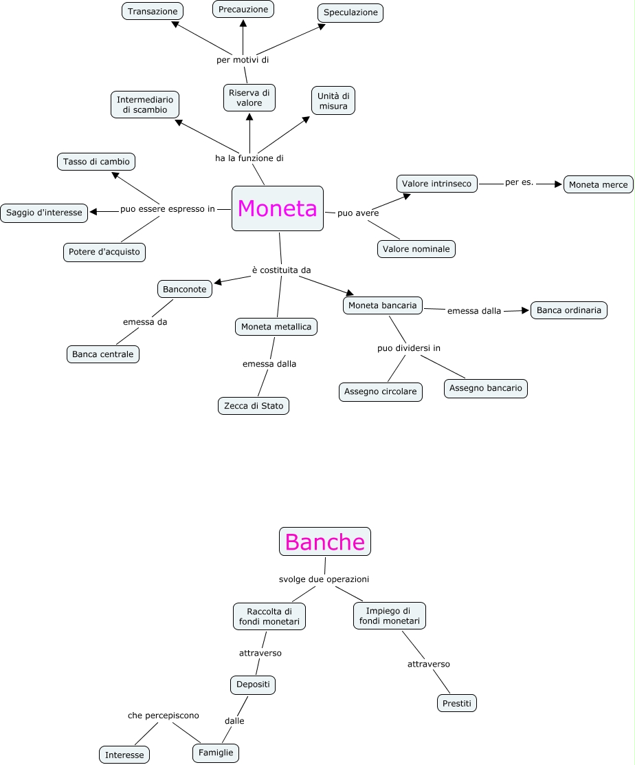 Questa Cmap, creata con IHMC CmapTools, contiene informazioni relative a: la moneta 4B, Moneta ha la funzione di Unità di misura, Moneta puo essere espresso in Potere d'acquisto, Moneta bancaria puo dividersi in Assegno bancario, Moneta metallica emessa dalla Zecca di Stato, Banche svolge due operazioni Raccolta di fondi monetari, Moneta bancaria emessa dalla Banca ordinaria, Moneta puo avere Valore intrinseco, Riserva di valore per motivi di Precauzione, Banconote emessa da Banca centrale, Moneta ha la funzione di Riserva di valore, Moneta è costituita da Moneta metallica, Impiego di fondi monetari attraverso Prestiti, Riserva di valore per motivi di Transazione, Moneta è costituita da Banconote, Moneta ha la funzione di Intermediario di scambio, Famiglie che percepiscono Interesse, Moneta puo essere espresso in Tasso di cambio, Moneta puo avere Valore nominale, Riserva di valore per motivi di Speculazione, Banche svolge due operazioni Impiego di fondi monetari