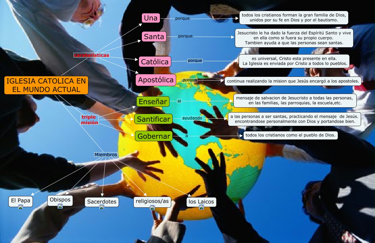 Este Cmap, tiene información relacionada con: tema 8, IGLESIA CATOLICA EN EL MUNDO ACTUAL triple misión Gobernar, Gobernar a todos los cristianos como el pueblo de Dios., Enseñar el mensaje de salvacion de Jesucristo a todas las personas, en las familias, las parroquias, la escuela,etc., IGLESIA CATOLICA EN EL MUNDO ACTUAL caraterísticas Santa, IGLESIA CATOLICA EN EL MUNDO ACTUAL Miembros los Laicos, Santa porque Jesucristo le ha dado la fuerza del Espíritú Santo y vive en ella como si fuera su propio cuerpo. Tambien ayuda a que las personas sean santas., IGLESIA CATOLICA EN EL MUNDO ACTUAL Miembros Sacerdotes, IGLESIA CATOLICA EN EL MUNDO ACTUAL caraterísticas Católica, IGLESIA CATOLICA EN EL MUNDO ACTUAL triple misión Enseñar, Una porque todos los cristianos forman la gran familia de Dios, unidos por su fe en Dios y por el bautismo., IGLESIA CATOLICA EN EL MUNDO ACTUAL caraterísticas Apostólica, IGLESIA CATOLICA EN EL MUNDO ACTUAL triple misión Santificar, IGLESIA CATOLICA EN EL MUNDO ACTUAL Miembros religiosos/as, Apostólica porque continua realizando la mision que Jesús encargó a los apostoles., IGLESIA CATOLICA EN EL MUNDO ACTUAL caraterísticas Una, IGLESIA CATOLICA EN EL MUNDO ACTUAL Miembros Obispos, IGLESIA CATOLICA EN EL MUNDO ACTUAL Miembros El Papa, Católica porque es universal, Cristo esta presente en ella. La Iglesia es enviada por Cristo a todos lo pueblos., Santificar ayudando a las personas a ser santas, practicando el mensaje de Jesús. encontrandose personalmente con Dios y portandose bien.