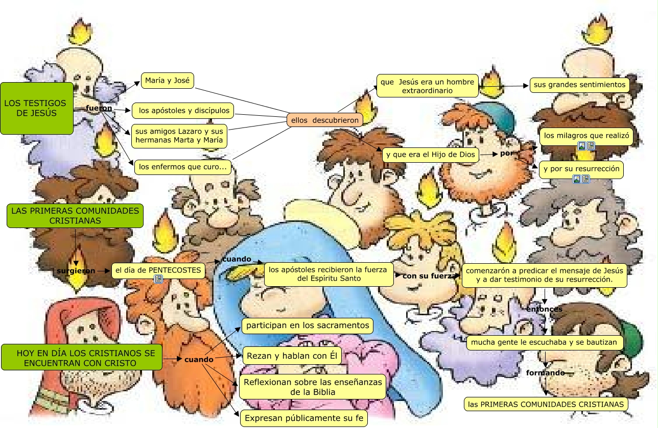 Este Cmap, tiene información relacionada con: tema 7, mucha gente le escuchaba y se bautizan formando las PRIMERAS COMUNIDADES CRISTIANAS, comenzarón a predicar el mensaje de Jesús y a dar testimonio de su resurrección. entonces mucha gente le escuchaba y se bautizan, HOY EN DÍA LOS CRISTIANOS SE ENCUENTRAN CON CRISTO cuando Reflexionan sobre las enseñanzas de la Biblia, María y José ???? ellos descubrieron, que Jesús era un hombre extraordinario por sus grandes sentimientos, y que era el Hijo de Dios por y por su resurrección, LOS TESTIGOS DE JESÚS fueron sus amigos Lazaro y sus hermanas Marta y María, sus amigos Lazaro y sus hermanas Marta y María ???? ellos descubrieron, ellos descubrieron ???? y que era el Hijo de Dios, LOS TESTIGOS DE JESÚS fueron los apóstoles y discípulos, los apóstoles y discípulos ???? ellos descubrieron, HOY EN DÍA LOS CRISTIANOS SE ENCUENTRAN CON CRISTO cuando Rezan y hablan con Él, LOS TESTIGOS DE JESÚS fueron los enfermos que curo..., HOY EN DÍA LOS CRISTIANOS SE ENCUENTRAN CON CRISTO cuando participan en los sacramentos, LOS TESTIGOS DE JESÚS fueron María y José, el día de PENTECOSTES cuando los apóstoles recibieron la fuerza del Espíritu Santo, ellos descubrieron ???? que Jesús era un hombre extraordinario, LAS PRIMERAS COMUNIDADES CRISTIANAS surgieron el día de PENTECOSTES, HOY EN DÍA LOS CRISTIANOS SE ENCUENTRAN CON CRISTO cuando Expresan públicamente su fe, y que era el Hijo de Dios por los milagros que realizó