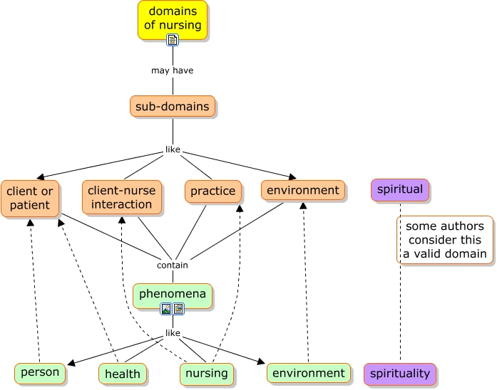 This Concept Map, created with IHMC CmapTools, has information related to: domains, spiritual spirituality, environment environment, nursing client-nurse interaction, sub-domains like client-nurse interaction, phenomena like person, sub-domains like practice, domains of nursing may have sub-domains, sub-domains like environment, practice contain phenomena, environment contain phenomena, phenomena like health, client or patient contain phenomena, phenomena like environment, health client or patient, sub-domains like client or patient, nursing practice, client-nurse interaction contain phenomena, person client or patient, phenomena like nursing