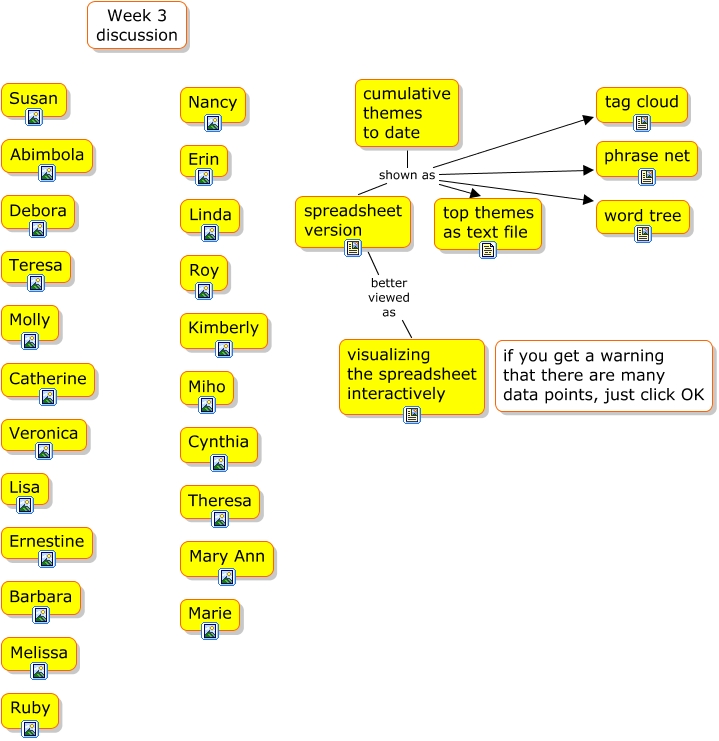 This Concept Map, created with IHMC CmapTools, has information related to: week 3 discussion, cumulative themes to date shown as spreadsheet version, cumulative themes to date shown as phrase net, cumulative themes to date shown as tag cloud, cumulative themes to date shown as word tree, spreadsheet version better viewed as visualizing the spreadsheet interactively, cumulative themes to date shown as top themes as text file