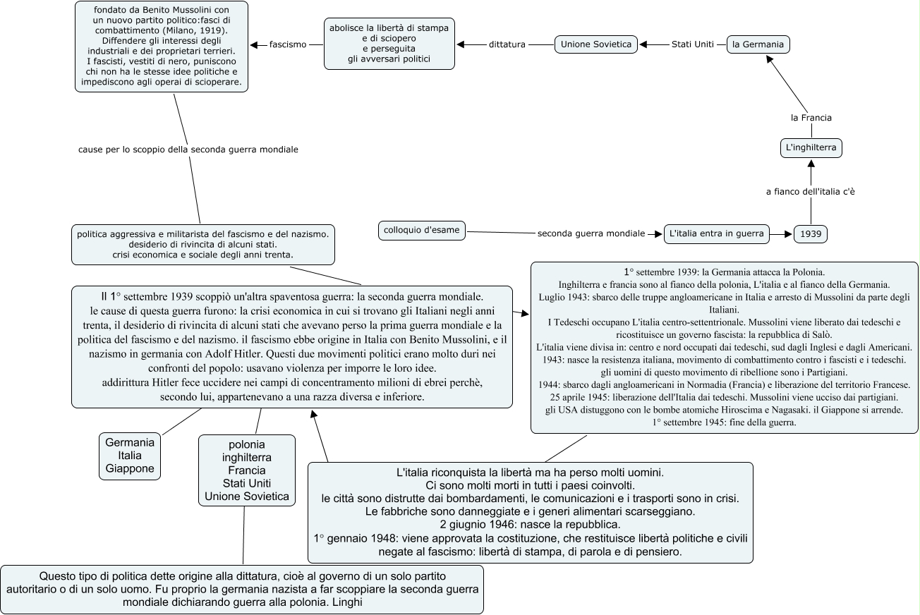 Questa Cmap, creata con IHMC CmapTools, contiene informazioni relative a: mappa storia.cmap, abolisce la libertà di stampa e di sciopero e perseguita gli avversari politici fascismo fondato da Benito Mussolini con un nuovo partito politico:fasci di combattimento (Milano, 1919). Diffendere gli interessi degli industriali e dei proprietari terrieri. I fascisti, vestiti di nero, puniscono chi non ha le stesse idee politiche e impediscono agli operai di scioperare., fondato da Benito Mussolini con un nuovo partito politico:fasci di combattimento (Milano, 1919). Diffendere gli interessi degli industriali e dei proprietari terrieri. I fascisti, vestiti di nero, puniscono chi non ha le stesse idee politiche e impediscono agli operai di scioperare. cause per lo scoppio della seconda guerra mondiale politica aggressiva e militarista del fascismo e del nazismo. desiderio di rivincita di alcuni stati. crisi economica e sociale degli anni trenta., Il 1° settembre 1939 scoppiò un'altra spaventosa guerra: la seconda guerra mondiale. le cause di questa guerra furono: la crisi economica in cui si trovano gli Italiani negli anni trenta, il desiderio di rivincita di alcuni stati che avevano perso la prima guerra mondiale e la politica del fascismo e del nazismo. il fascismo ebbe origine in Italia con Benito Mussolini, e il nazismo in germania con Adolf Hitler. Questi due movimenti politici erano molto duri nei confronti del popolo: usavano violenza per imporre le loro idee. addirittura Hitler fece uccidere nei campi di concentramento milioni di ebrei perchè, secondo lui, appartenevano a una razza diversa e inferiore. ???? Germania Italia Giappone, L'italia riconquista la libertà ma ha perso molti uomini. Ci sono molti morti in tutti i paesi coinvolti. le città sono distrutte dai bombardamenti, le comunicazioni e i trasporti sono in crisi. Le fabbriche sono danneggiate e i generi alimentari scarseggiano. 2 giugnio 1946: nasce la repubblica. 1° gennaio 1948: viene approvata la costituzione, che restituisce libertà politiche e civili negate al fascismo: libertà di stampa, di parola e di pensiero. ???? Il 1° settembre 1939 scoppiò un'altra spaventosa guerra: la seconda guerra mondiale. le cause di questa guerra furono: la crisi economica in cui si trovano gli Italiani negli anni trenta, il desiderio di rivincita di alcuni stati che avevano perso la prima guerra mondiale e la politica del fascismo e del nazismo. il fascismo ebbe origine in Italia con Benito Mussolini, e il nazismo in germania con Adolf Hitler. Questi due movimenti politici erano molto duri nei confronti del popolo: usavano violenza per imporre le loro idee. addirittura Hitler fece uccidere nei campi di concentramento milioni di ebrei perchè, secondo lui, appartenevano a una razza diversa e inferiore., Il 1° settembre 1939 scoppiò un'altra spaventosa guerra: la seconda guerra mondiale. le cause di questa guerra furono: la crisi economica in cui si trovano gli Italiani negli anni trenta, il desiderio di rivincita di alcuni stati che avevano perso la prima guerra mondiale e la politica del fascismo e del nazismo. il fascismo ebbe origine in Italia con Benito Mussolini, e il nazismo in germania con Adolf Hitler. Questi due movimenti politici erano molto duri nei confronti del popolo: usavano violenza per imporre le loro idee. addirittura Hitler fece uccidere nei campi di concentramento milioni di ebrei perchè, secondo lui, appartenevano a una razza diversa e inferiore. ???? polonia inghilterra Francia Stati Uniti Unione Sovietica, colloquio d'esame seconda guerra mondiale L'italia entra in guerra, la Germania Stati Uniti Unione Sovietica, polonia inghilterra Francia Stati Uniti Unione Sovietica ???? Questo tipo di politica dette origine alla dittatura, cioè al governo di un solo partito autoritario o di un solo uomo. Fu proprio la germania nazista a far scoppiare la seconda guerra mondiale dichiarando guerra alla polonia. Linghi, L'italia entra in guerra ???? 1939, politica aggressiva e militarista del fascismo e del nazismo. desiderio di rivincita di alcuni stati. crisi economica e sociale degli anni trenta. eventi 1° settembre 1939: la Germania attacca la Polonia. Inghilterra e francia sono al fianco della polonia, L'italia e al fianco della Germania. Luglio 1943: sbarco delle truppe angloamericane in Italia e arresto di Mussolini da parte degli Italiani. I Tedeschi occupano L'italia centro-settentrionale. Mussolini viene liberato dai tedeschi e ricostituisce un governo fascista: la repubblica di Salò. L'italia viene divisa in: centro e nord occupati dai tedeschi, sud dagli Inglesi e dagli Americani. 1943: nasce la resistenza italiana, movimento di combattimento contro i fascisti e i tedeschi. gli uomini di questo movimento di ribellione sono i Partigiani. 1944: sbarco dagli angloamericani in Normadia (Francia) e liberazione del territorio Francese. 25 aprile 1945: liberazione dell'Italia dai tedeschi. Mussolini viene ucciso dai partigiani. gli USA distuggono con le bombe atomiche Hiroscima e Nagasaki. il Giappone si arrende. 1° settembre 1945: fine della guerra., Unione Sovietica dittatura abolisce la libertà di stampa e di sciopero e perseguita gli avversari politici, 1939 a fianco dell'italia c'è L'inghilterra, L'inghilterra la Francia la Germania, 1° settembre 1939: la Germania attacca la Polonia. Inghilterra e francia sono al fianco della polonia, L'italia e al fianco della Germania. Luglio 1943: sbarco delle truppe angloamericane in Italia e arresto di Mussolini da parte degli Italiani. I Tedeschi occupano L'italia centro-settentrionale. Mussolini viene liberato dai tedeschi e ricostituisce un governo fascista: la repubblica di Salò. L'italia viene divisa in: centro e nord occupati dai tedeschi, sud dagli Inglesi e dagli Americani. 1943: nasce la resistenza italiana, movimento di combattimento contro i fascisti e i tedeschi. gli uomini di questo movimento di ribellione sono i Partigiani. 1944: sbarco dagli angloameri